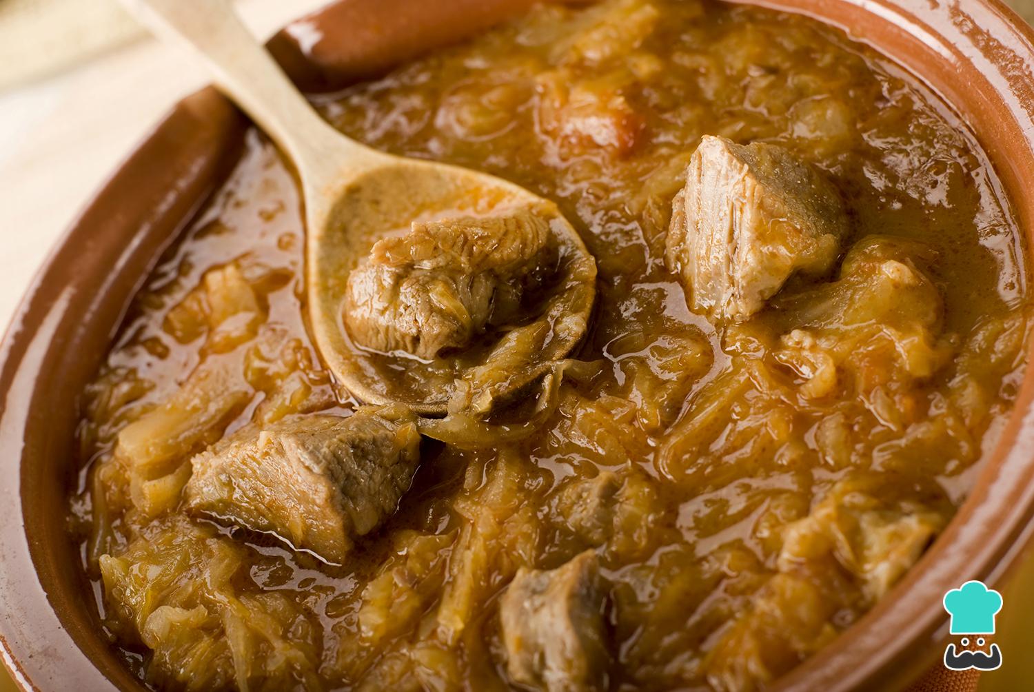 La carne, troceada en tacos o rodajas, como para cualquier estofado, se ha de poner en un recipiente, preferentemente una cazuela de barro.