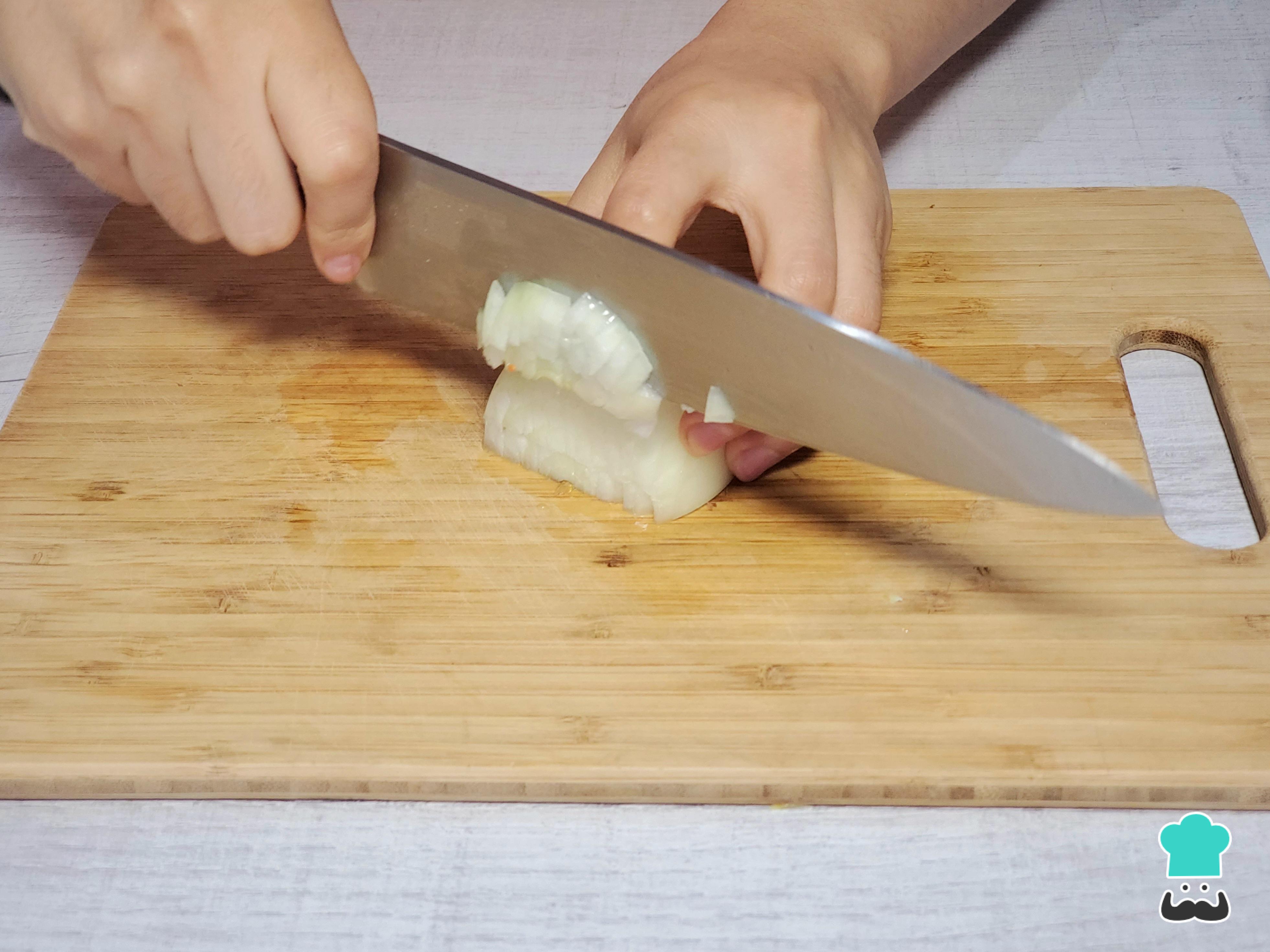 Comienza cortando la cebolla finamente, ya que la utilizaremos para preparar el aderezo. También pica el ajo en trozos pequeños o, si lo prefieres, puedes usar ajo molido. Corta el tomate en concassé, es decir, en cubos muy pequeños. Además, corta otro tomate en gajos rústicos junto con una zanahoria para licuar. Por último, corta la zanahoria en rodajas para la decoración.
