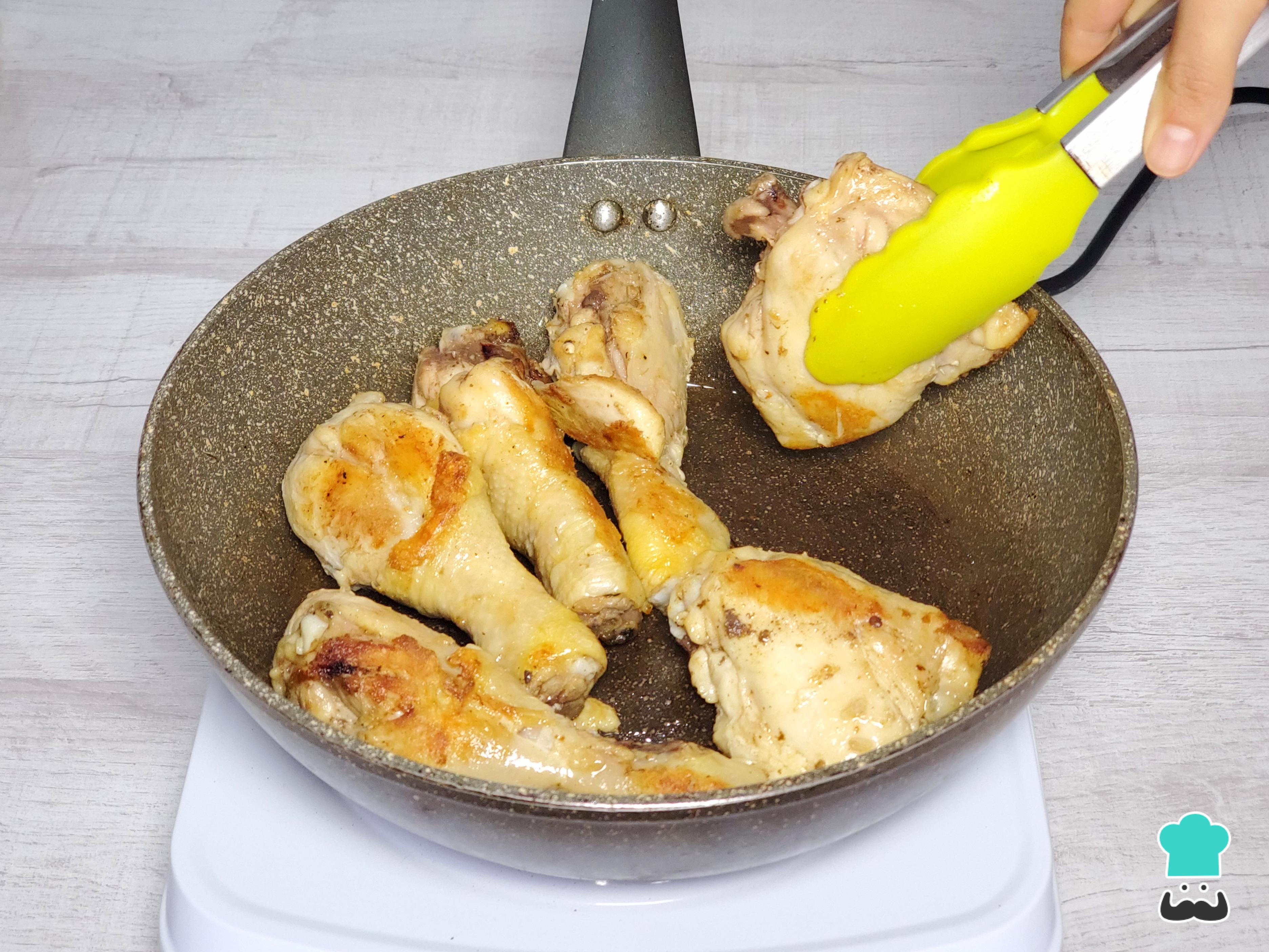 En una olla o sartén profunda, vierte un buen chorro de aceite y coloca, una por una, las presas de pollo previamente salpimentadas para dorarlas. Cocina hasta que estén doradas por ambos lados y resérvalas aparte.