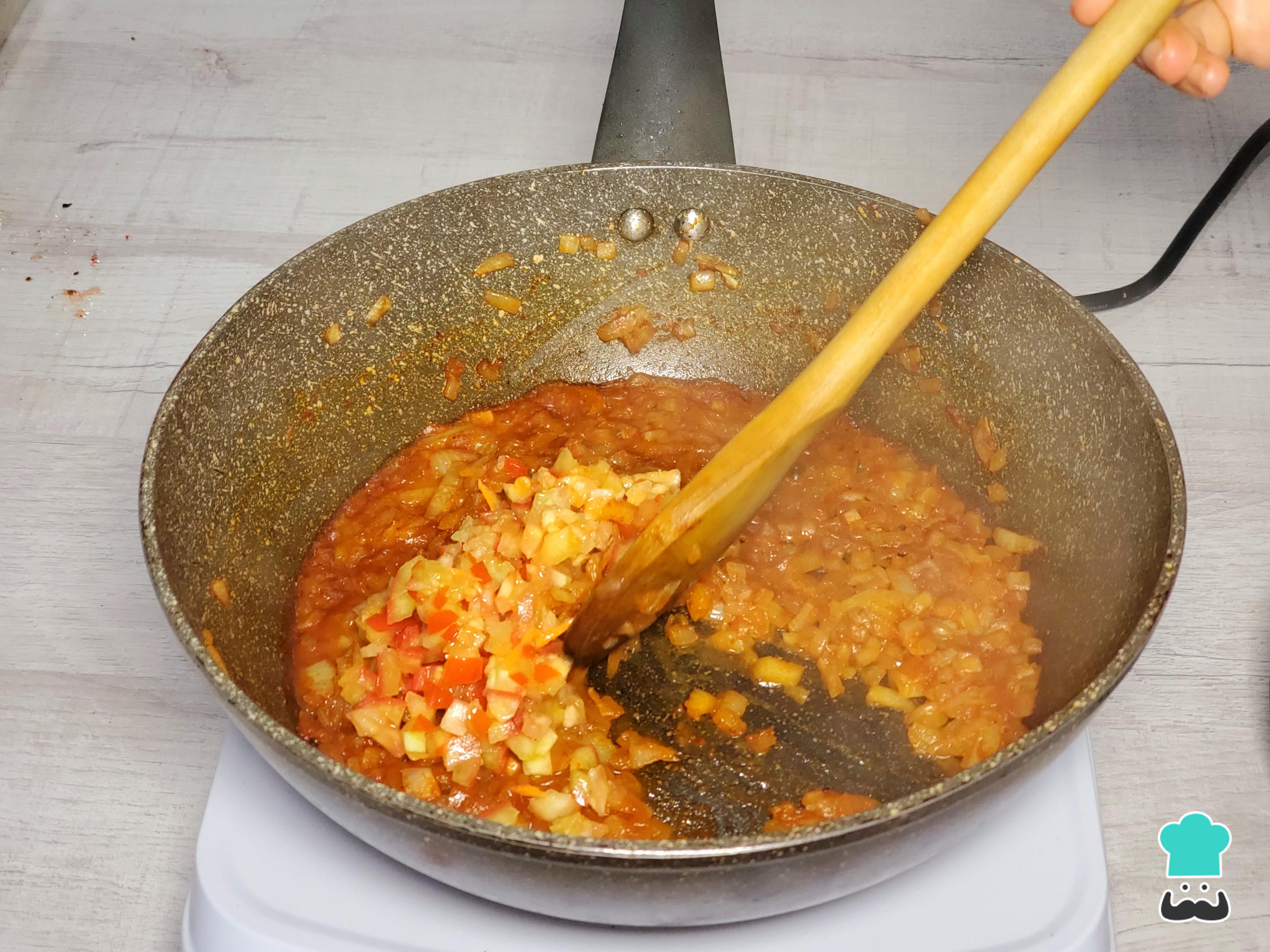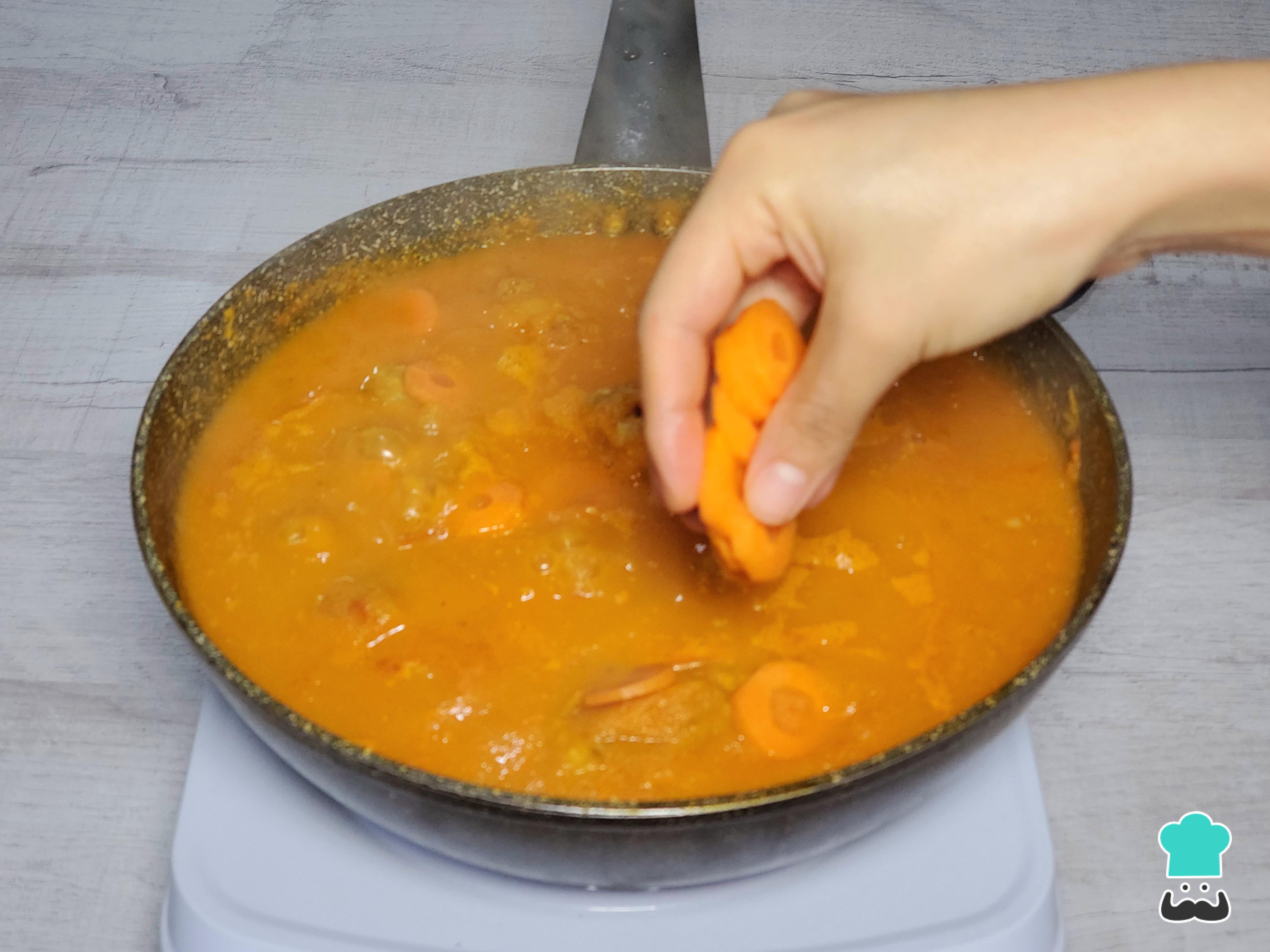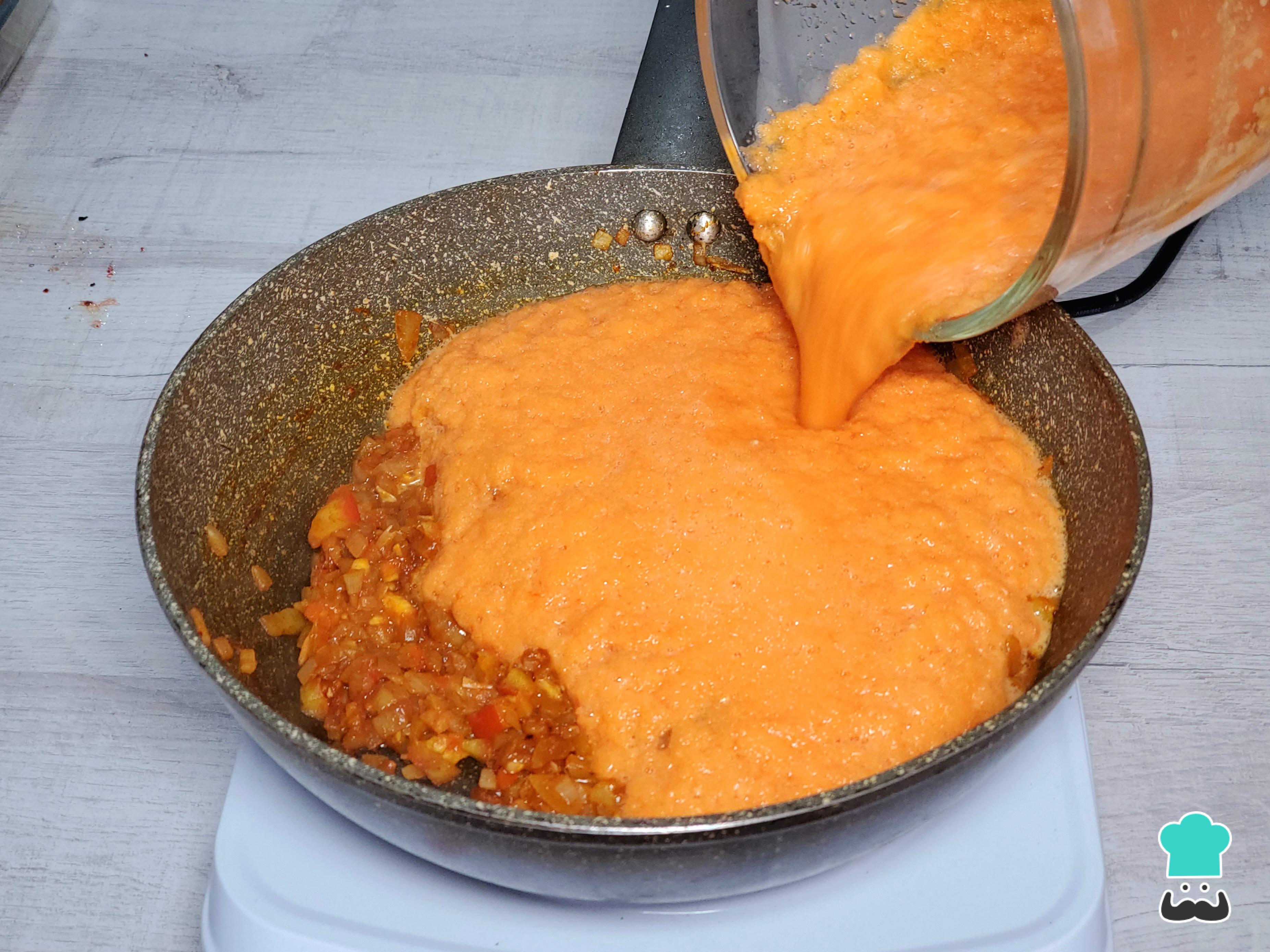 Después de unos 20 minutos, cuando el aderezo haya cocido, añade el tomate picado y remueve durante unos minutos más. Aparte, licúa los trozos de tomate y zanahoria con unos buenos cucharones de caldo de pollo hasta obtener una pasta homogénea, luego vierte esta mezcla en la olla con el aderezo.