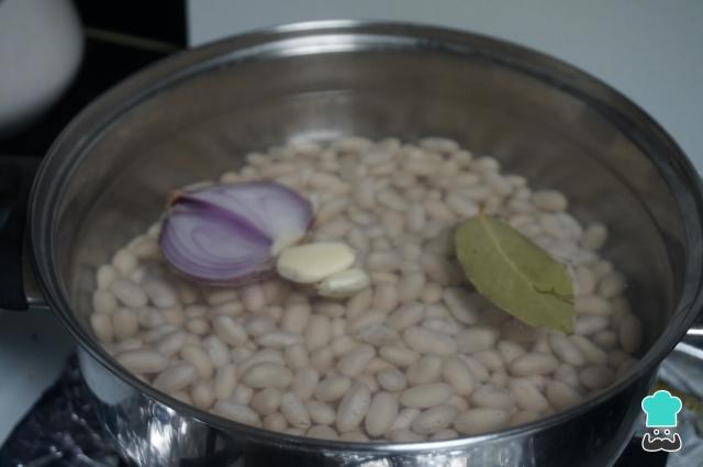 Echa las alubias en una cazuela con agua limpia, añade una cebolla entera o partida por la mitad, una hoja de laurel y dos dientes de ajo enteros. Déjalas cociendo a fuego fuerte. Cuando empiece a hervir el agua, añade un vaso de agua fría para asustarlas y déjelas cocinando a fuego medio hasta que estén listas (aproximadamente 2 horas).