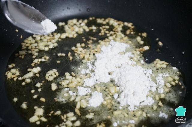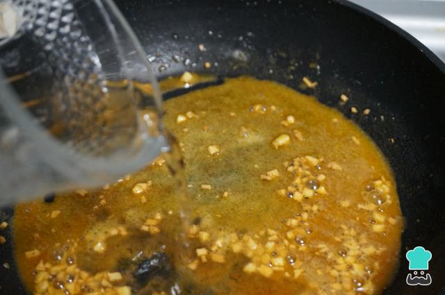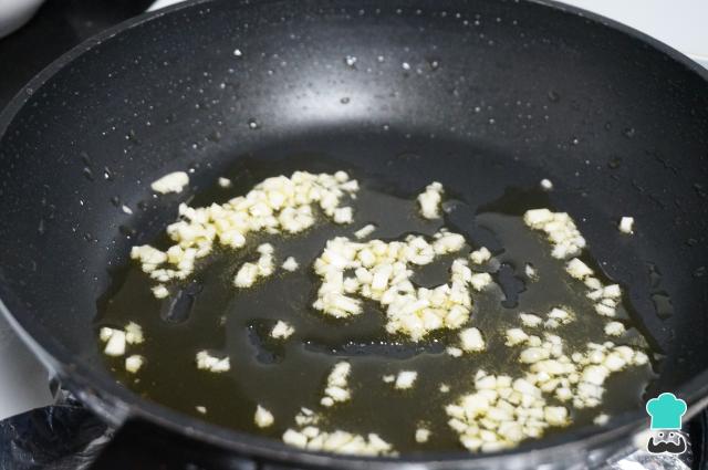 Pica 2-3 dientes de ajos. Echa un chorro de aceite en una sartén y cocina los ajos a fuego bajo para que no se quemen.