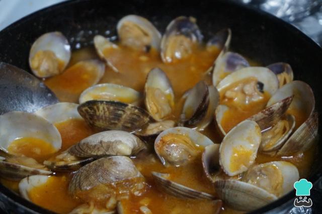 Añade un vaso pequeño de agua y echa las almejas en la sartén, déjalas hasta que se abran. Añade un poco de sal y pimienta. Apaga y reserva hasta que las alubias estén listas y puedas continuar con la receta de fabes con alubias asturianas.
