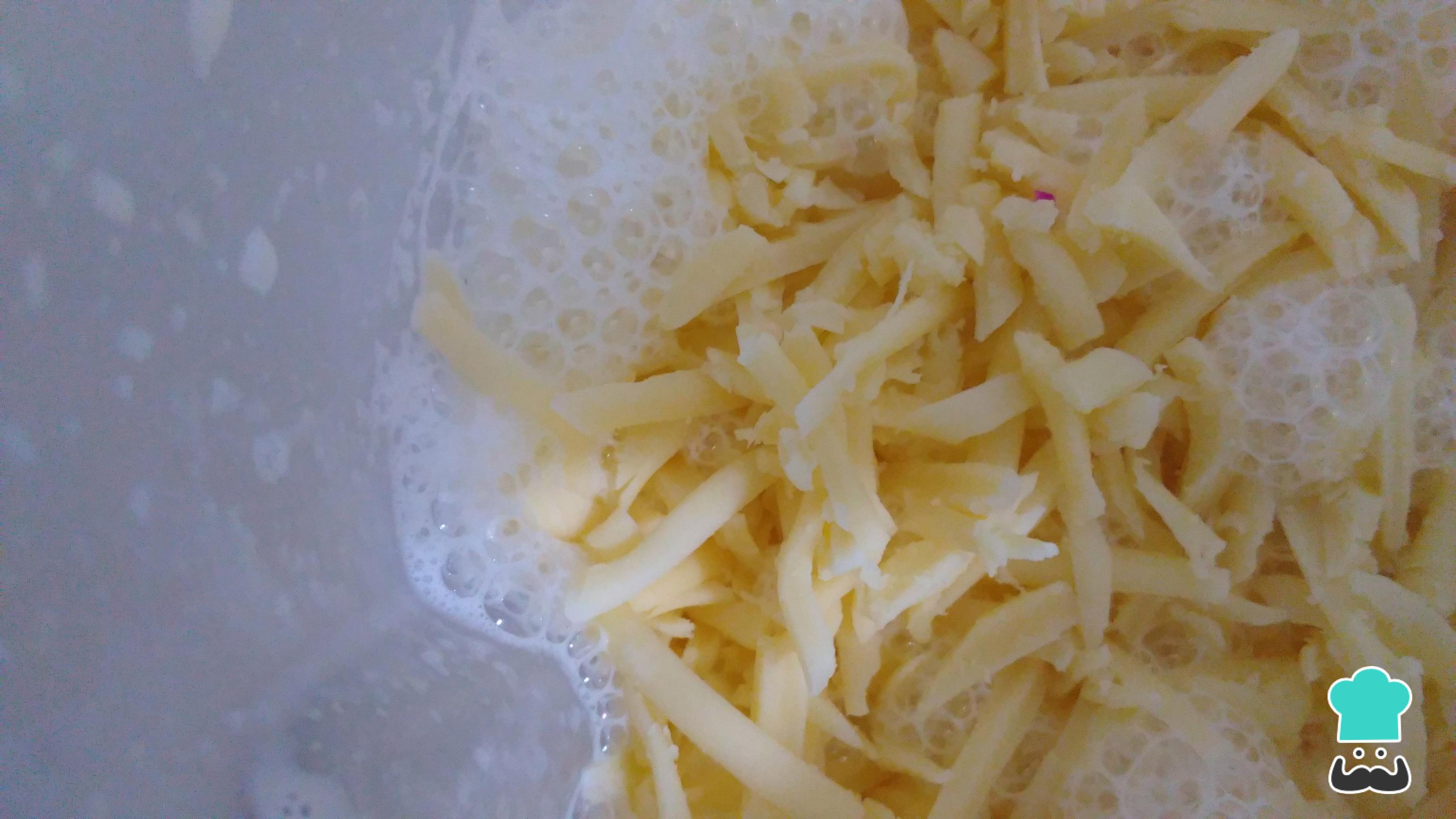 Por último, agrega el queso. La mezcla final es muy líquida. Esta es toda la preparación del fainá de queso licuado, como ves, es bastante fácil y rápida.