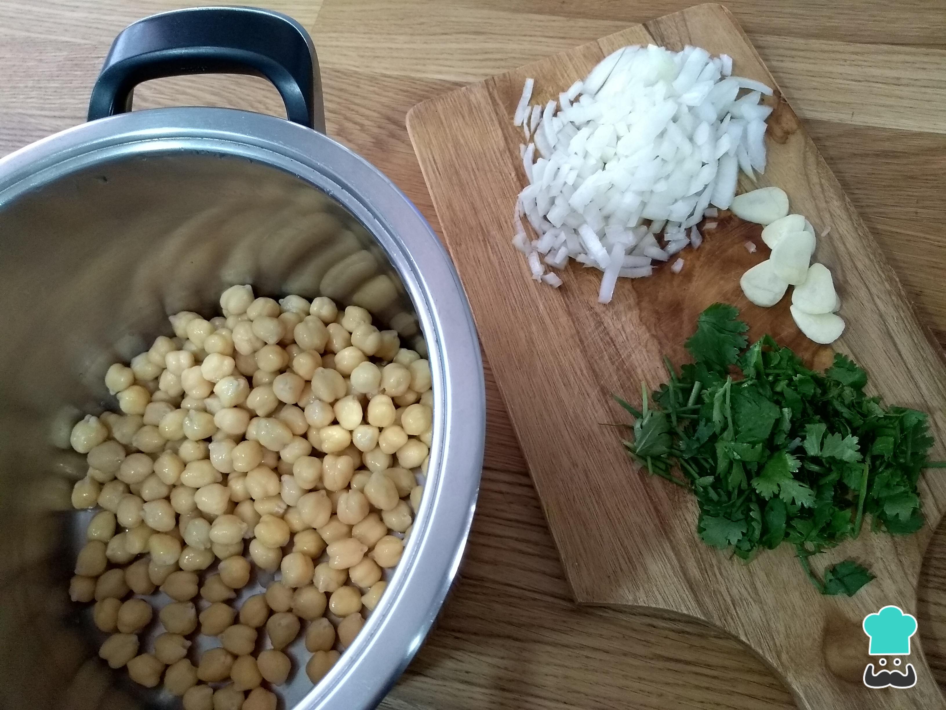 Cuando ya los tengas listos, pica finamente la cebolla, el ajo y el cilantro, y añádelos a los garbanzos escurridos.