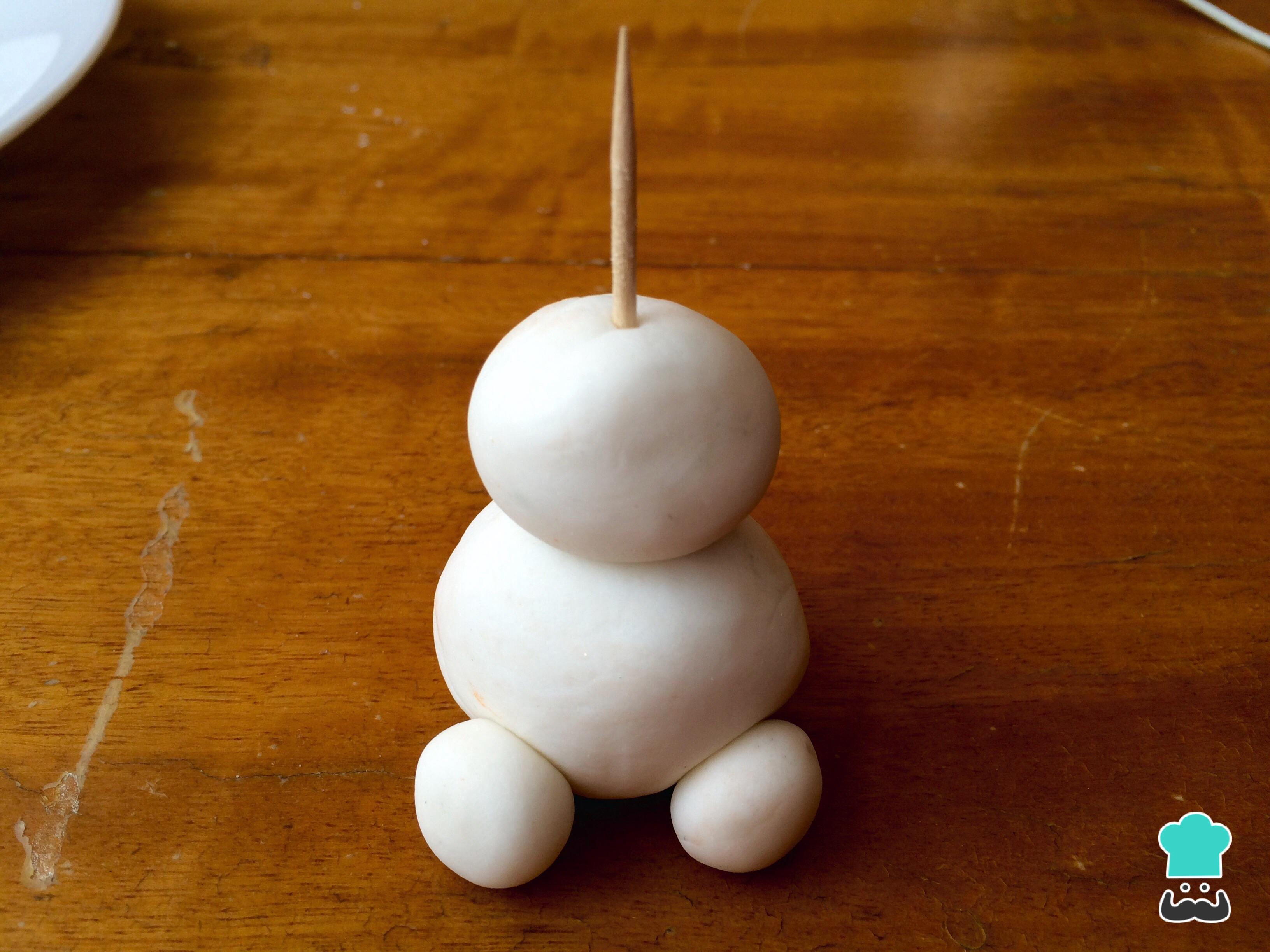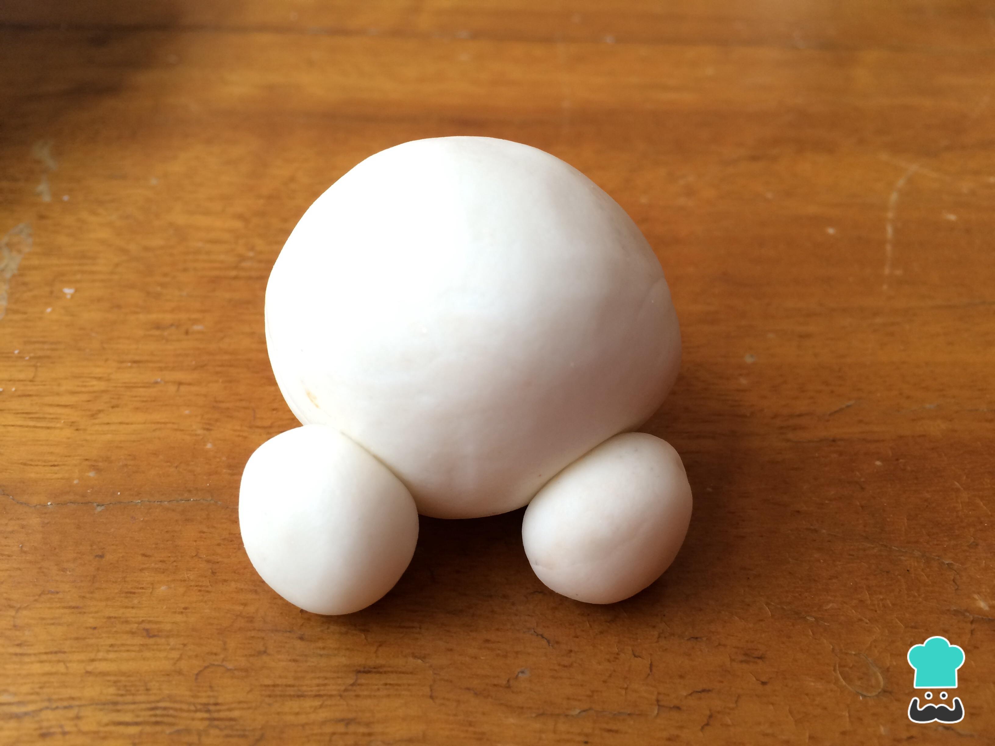 Con el fondant blanco realiza una bola grande y pega con agua dos bolitas en los lados simulando los pies.