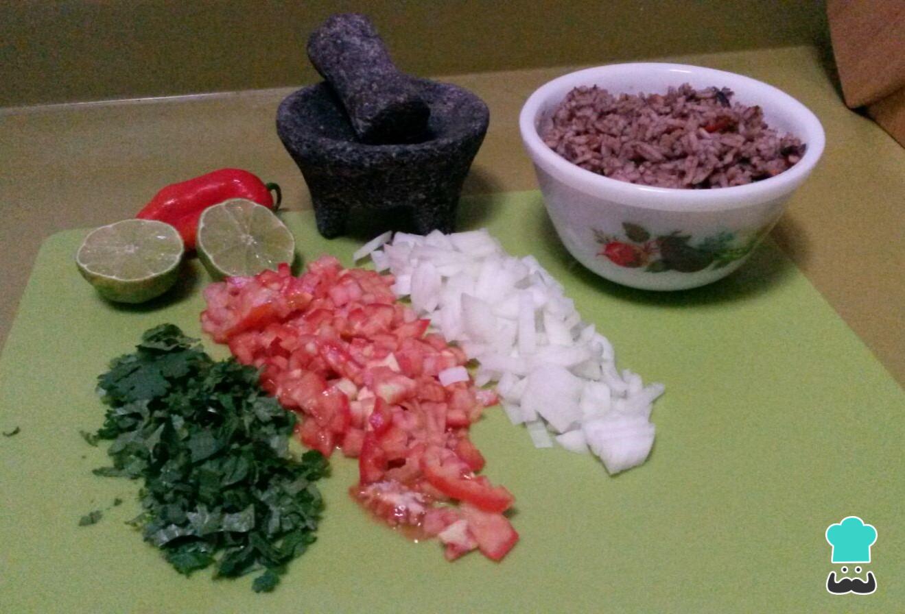 Para hacer el pico de gallo, mezcla el tomate, la cebolla, el cilantro y el jugo de limón. Todo picado finamente con un poquito de sal.