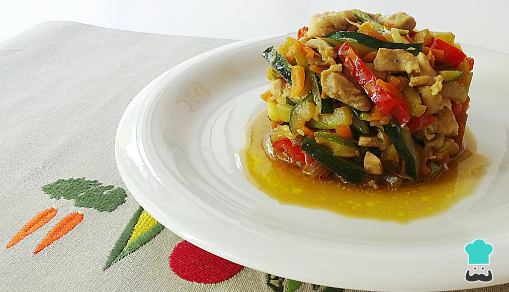 En una cazuela honda , preferentemente de barro, se pone el aceite a calentar; se refríe un poco la costilla o longaniza, y antes de que se dore totalmente, se añade el calabacín, la patata y la cebolla cortada en tiras finas.