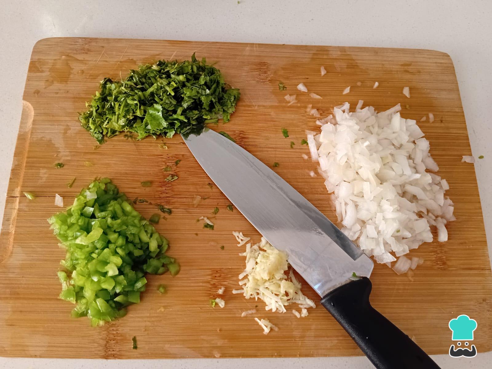 Corta los vegetales que añadirás a los fritos de atún: el ajo, el cilantro, la cebolla y el pimentón.