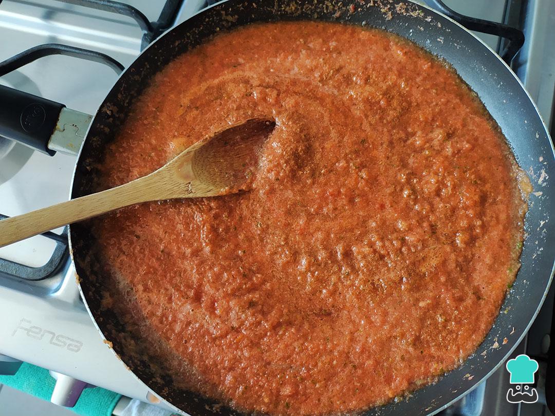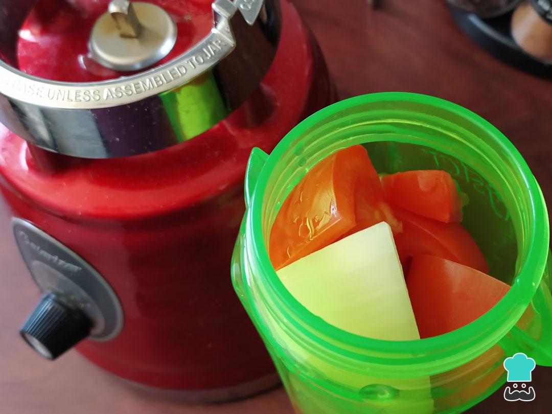 Lava y trocea la cebolla, el pimentón, los tomates, el perejil y los dientes de ajo. Tíralo todo en el vaso de la licuadora o procesadora con un chorro de agua. Licua hasta que quede una pasta bastante líquida.