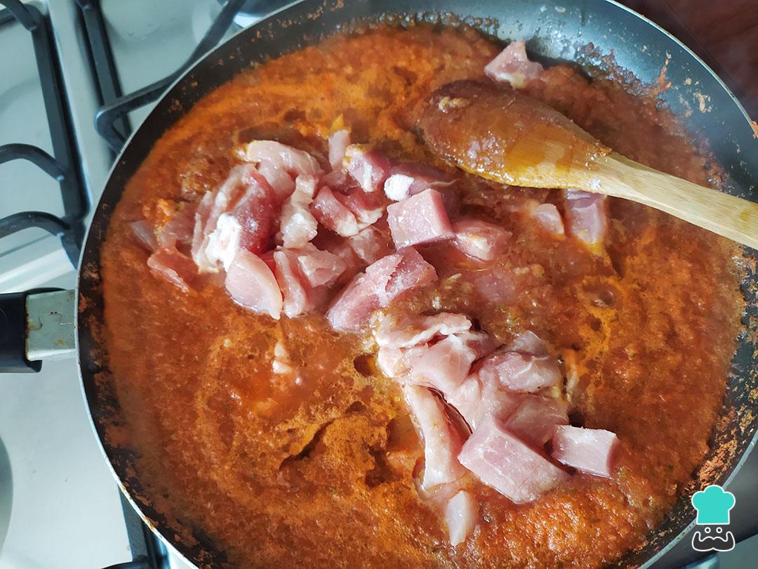 En una sartén agrega la pasta y llévala a fuego medio-bajo. Trocea la carne de cerdo en cubos medianos.
