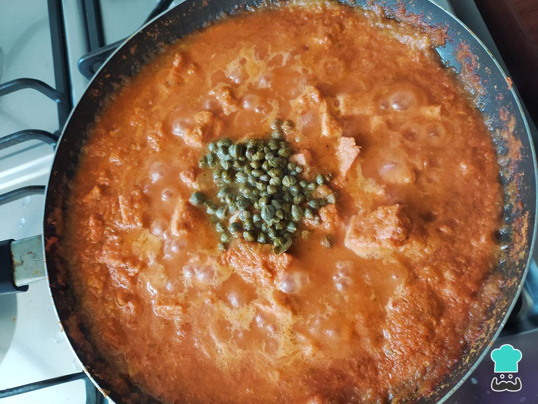 Por último añade las alcaparras y las aceitunas si utilizaste en la receta. Revuelve y cocina tapado por 5 minutos más.