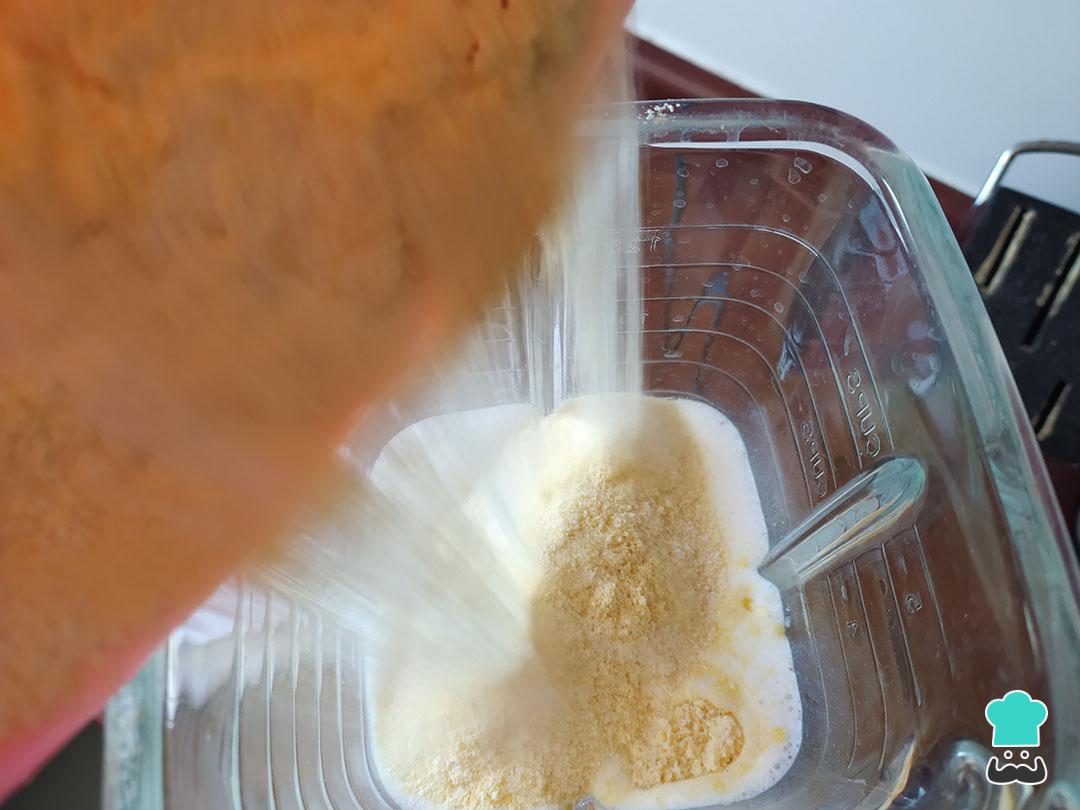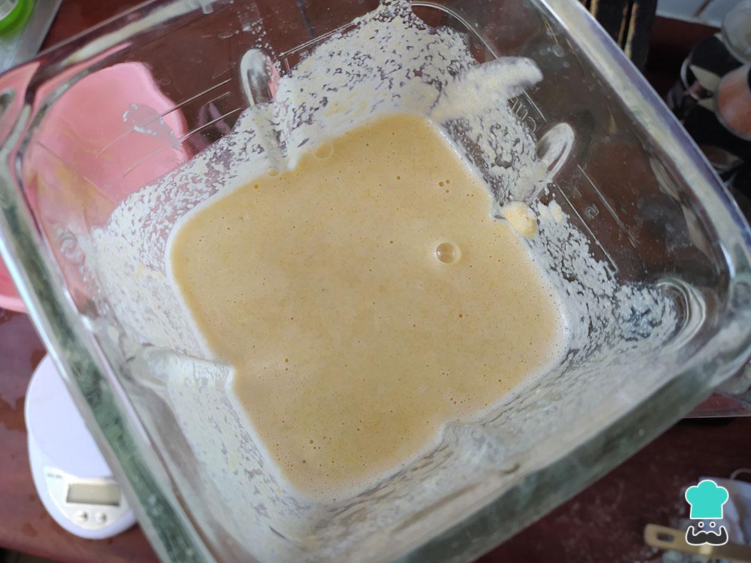 Para hacer el funche de maíz, agrega la leche y el agua en la licuadora, agrega los huevos y el azúcar moreno, mezcla muy bien y, poco a poco, añade la harina de maíz.