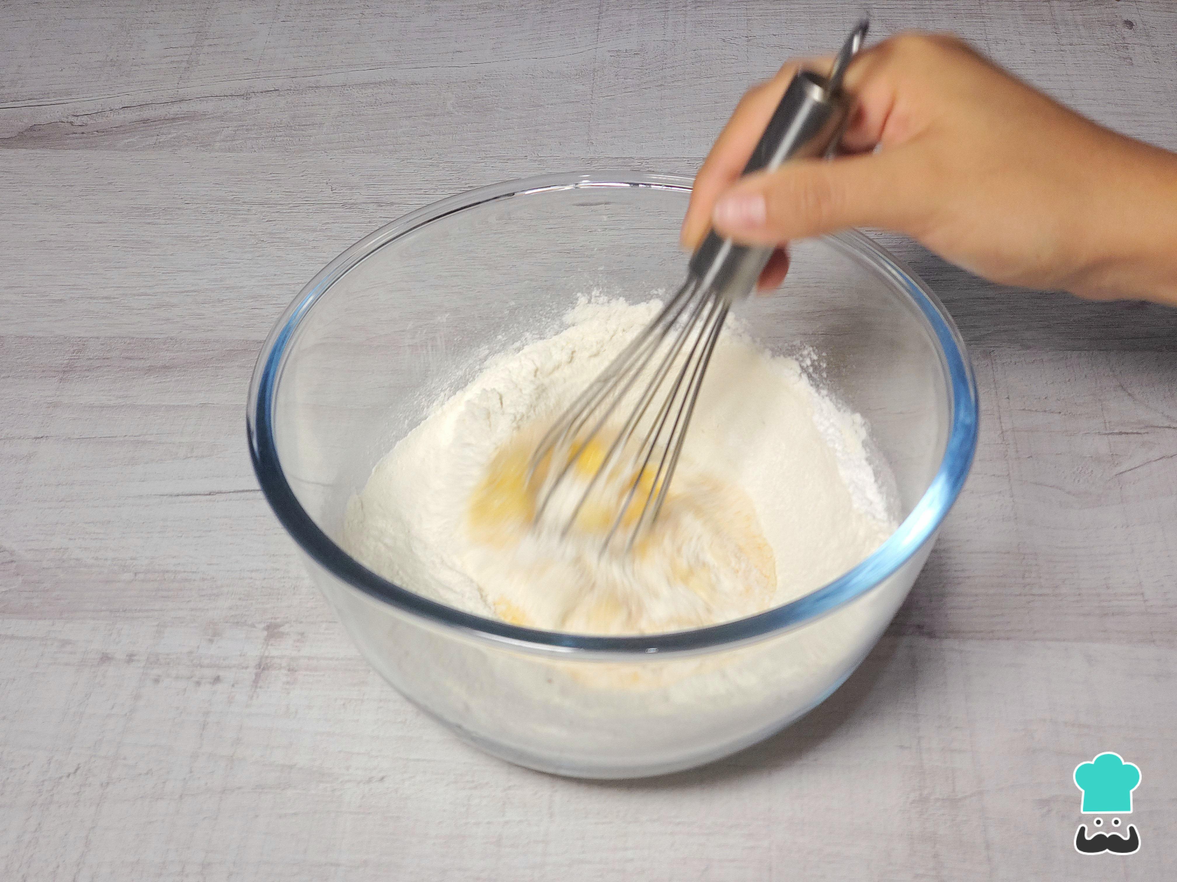 Añade los huevos y bate con un tenedor o, si prefieres, con un batidor de globo hasta obtener una masa homogénea, ligeramente pegajosa.
