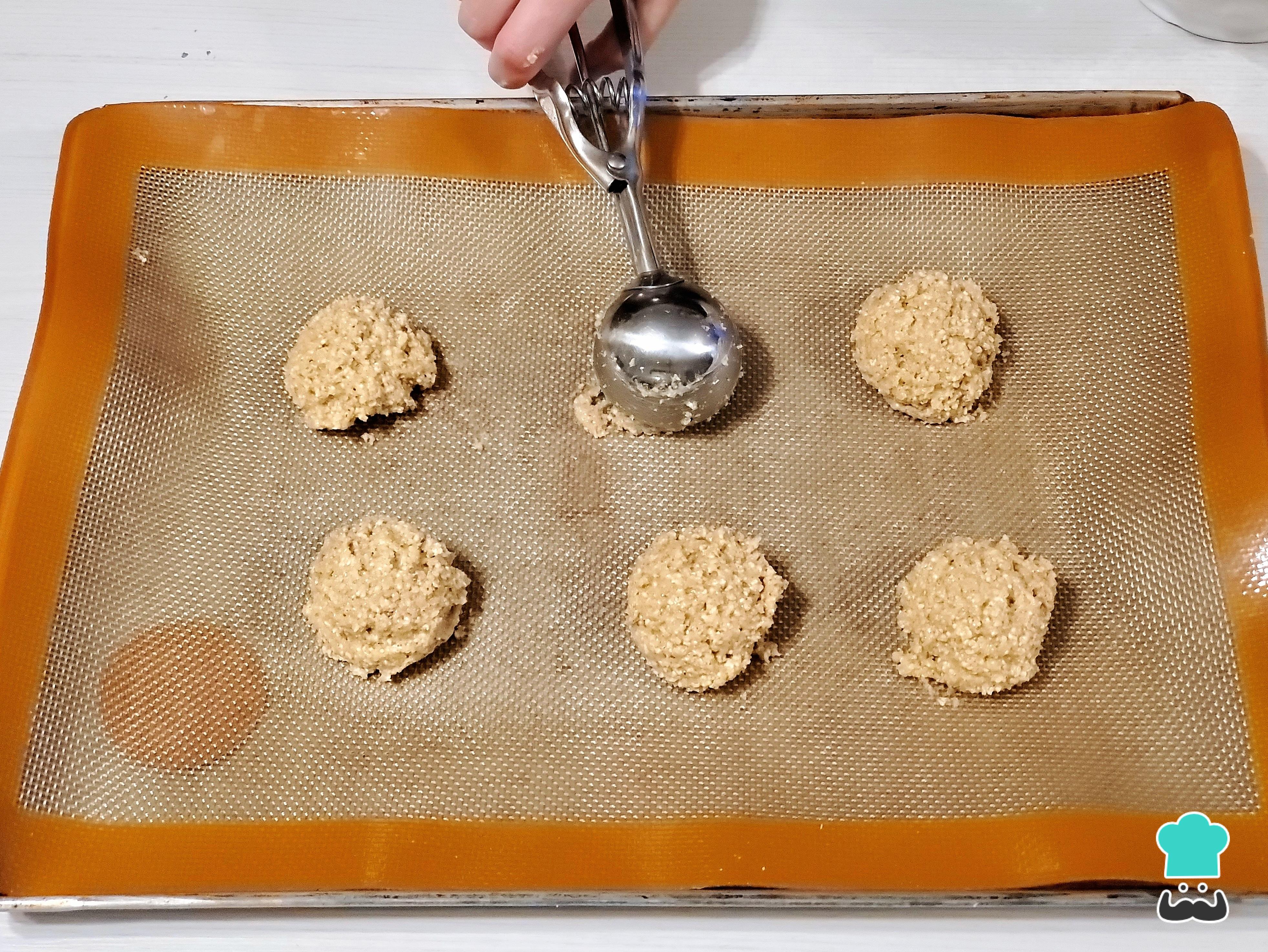 Sobre una placa con tapete de silicona o papel manteca, coloca pequeñas porciones de la masa. Puedes ayudarte con una cuchara de helados para que todas las galletas tengan el mismo tamaño o, simplemente, usar dos cucharas y darles forma circular.