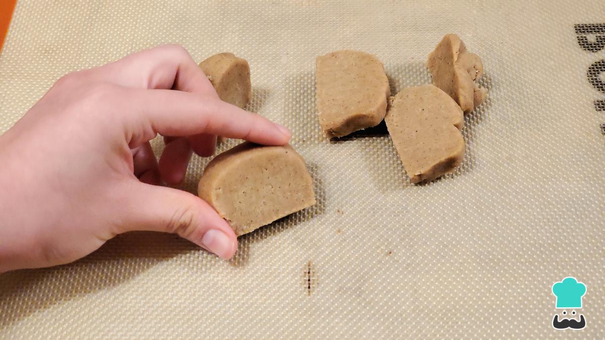 Divide la masa en seis partes iguales y luego corta cada parte por la mitad para obtener doce galletas.