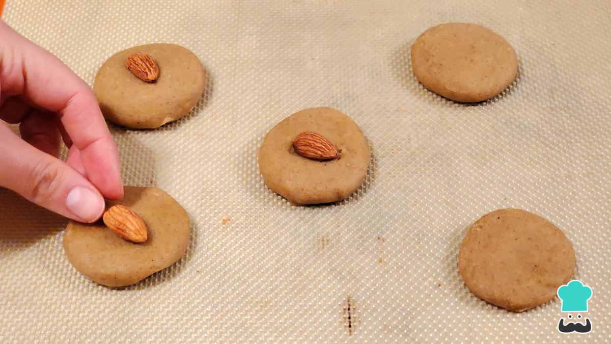 Forma cada porción con las manos, aplánala ligeramente con la palma y colócala sobre un tapete de silicona con una placa de horno debajo (o, si prefieres, sobre papel manteca). En el centro de cada galleta puedes colocar algunas almendras enteras.