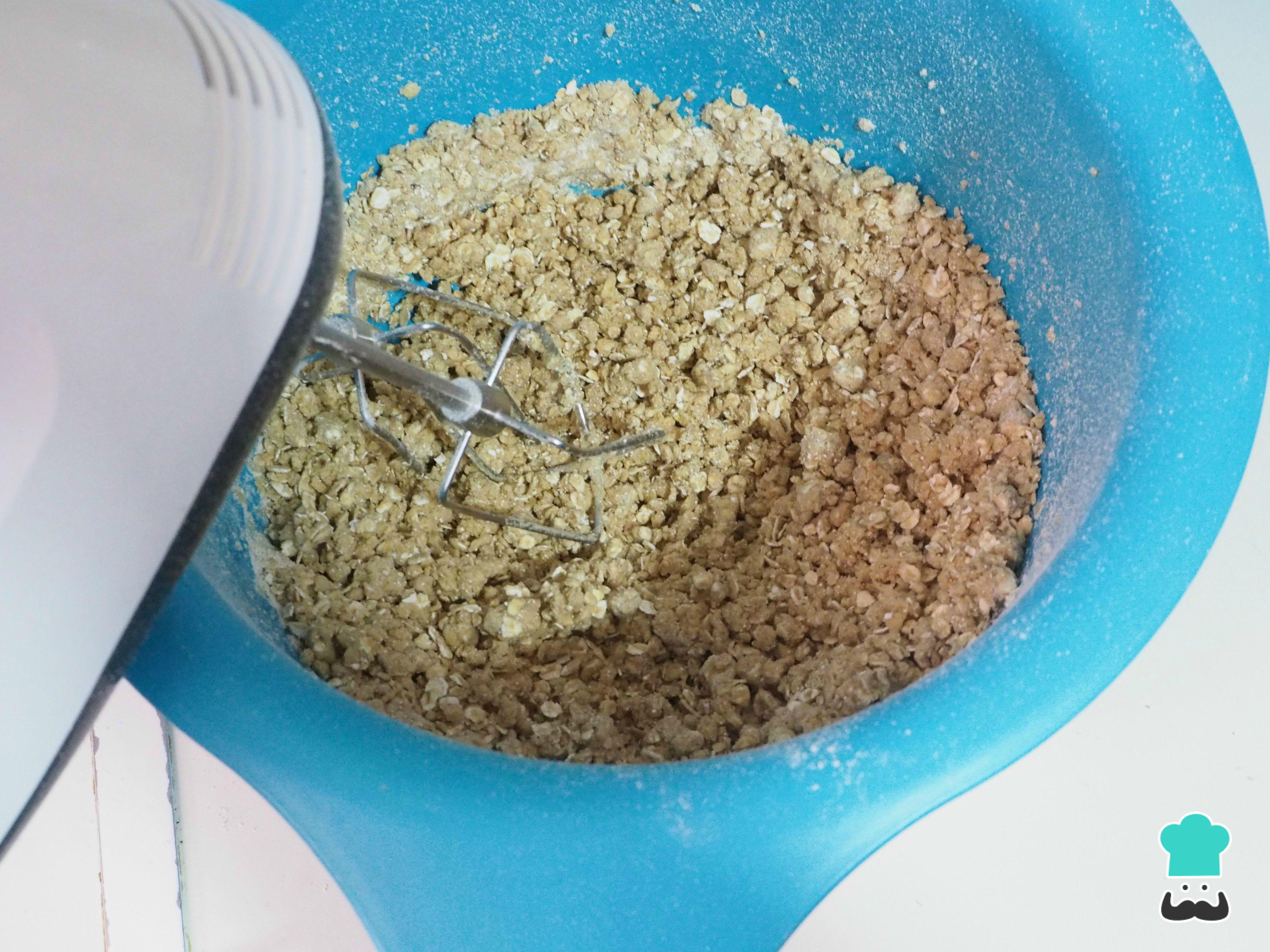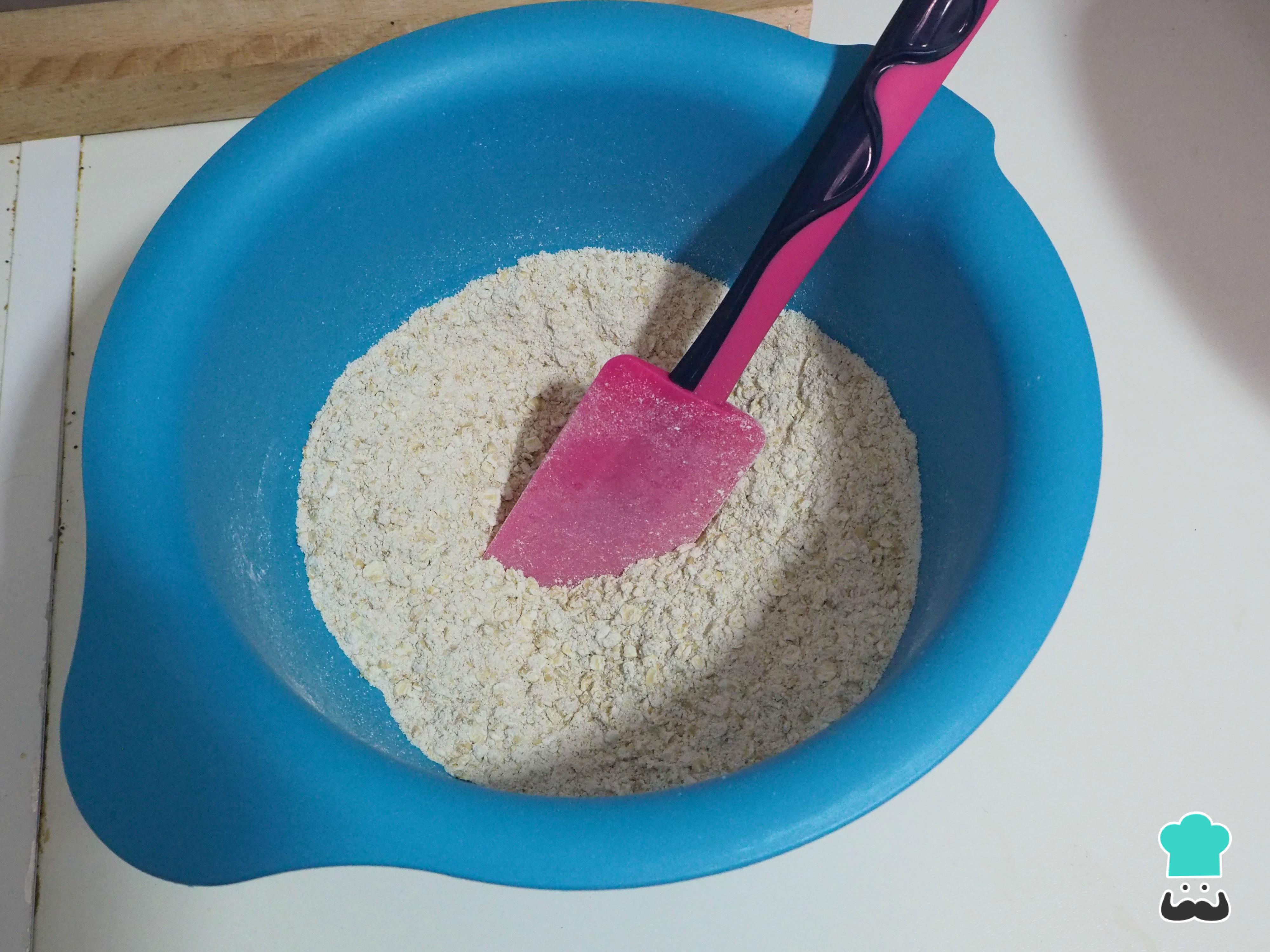 Mezclamos los ingredientes secos en un bol: harina de avena, los copos, el salvado, el azúcar moreno, la levadura y la sal. Al ser todos los ingredientes integrales y naturales, estas son unas galletas de avena fit estupendas. Puedes también hacer galletas de avena sin azúcar o usar otros edulcorantes saludables, así que te recomendamos visitar nuestro artículo Sustitutos del azúcar naturales y saludables para elegir el que más te guste.