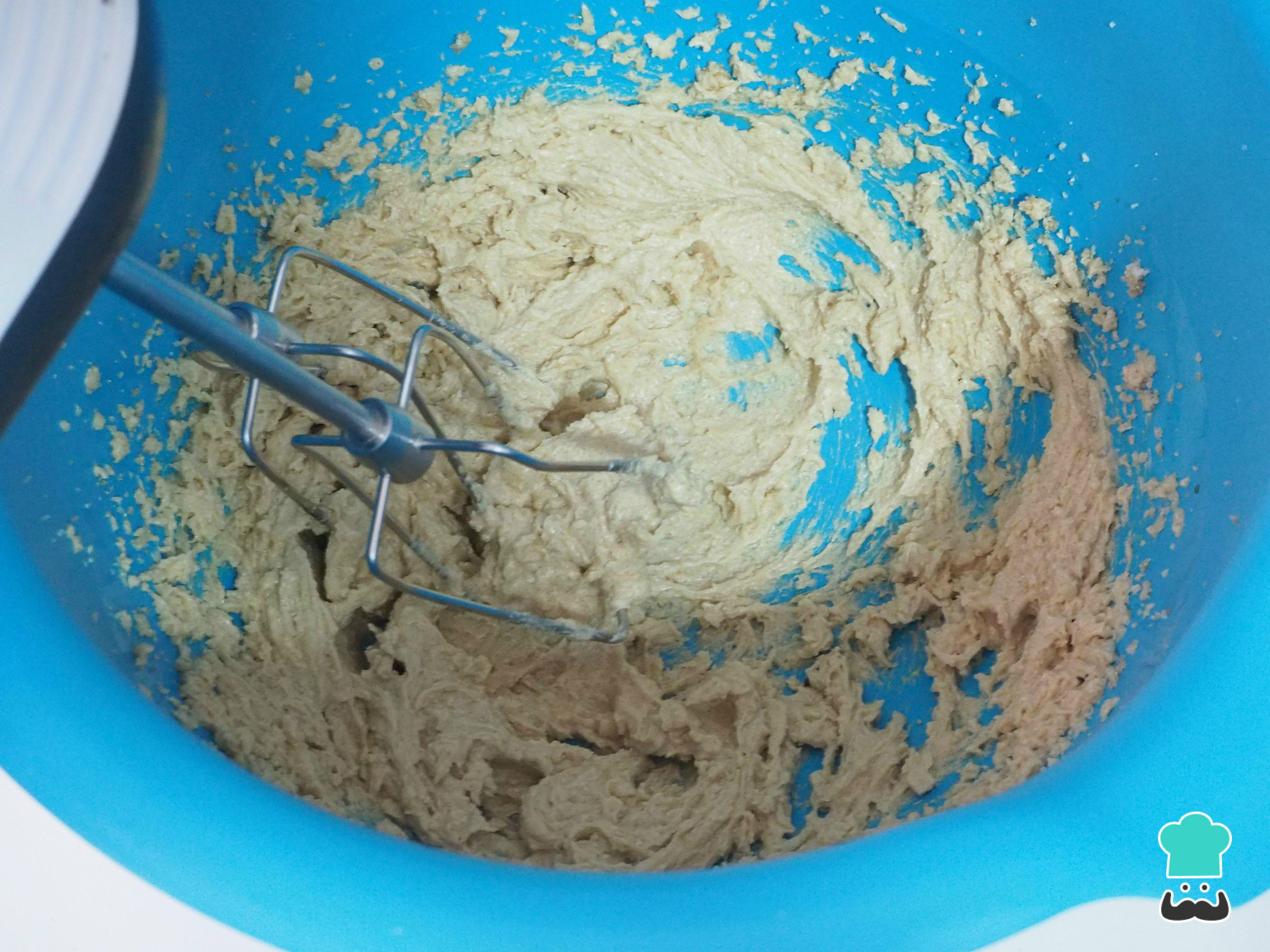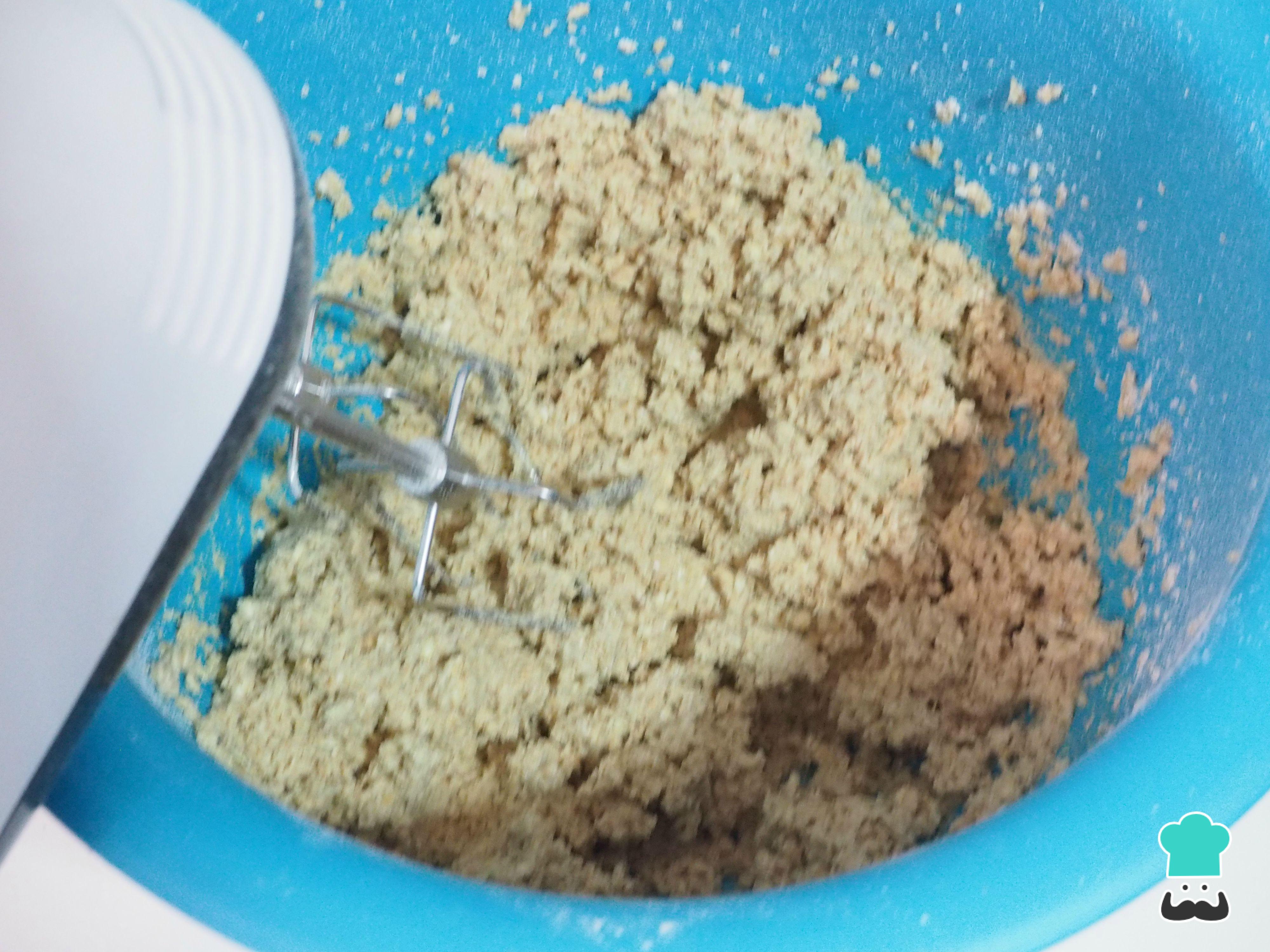 Incorporamos poco a poco los ingredientes secos a los húmedos, con cuidado para evitar formar grumos. Vamos mezclando hasta obtener una masa compacta que quedará algo seca.