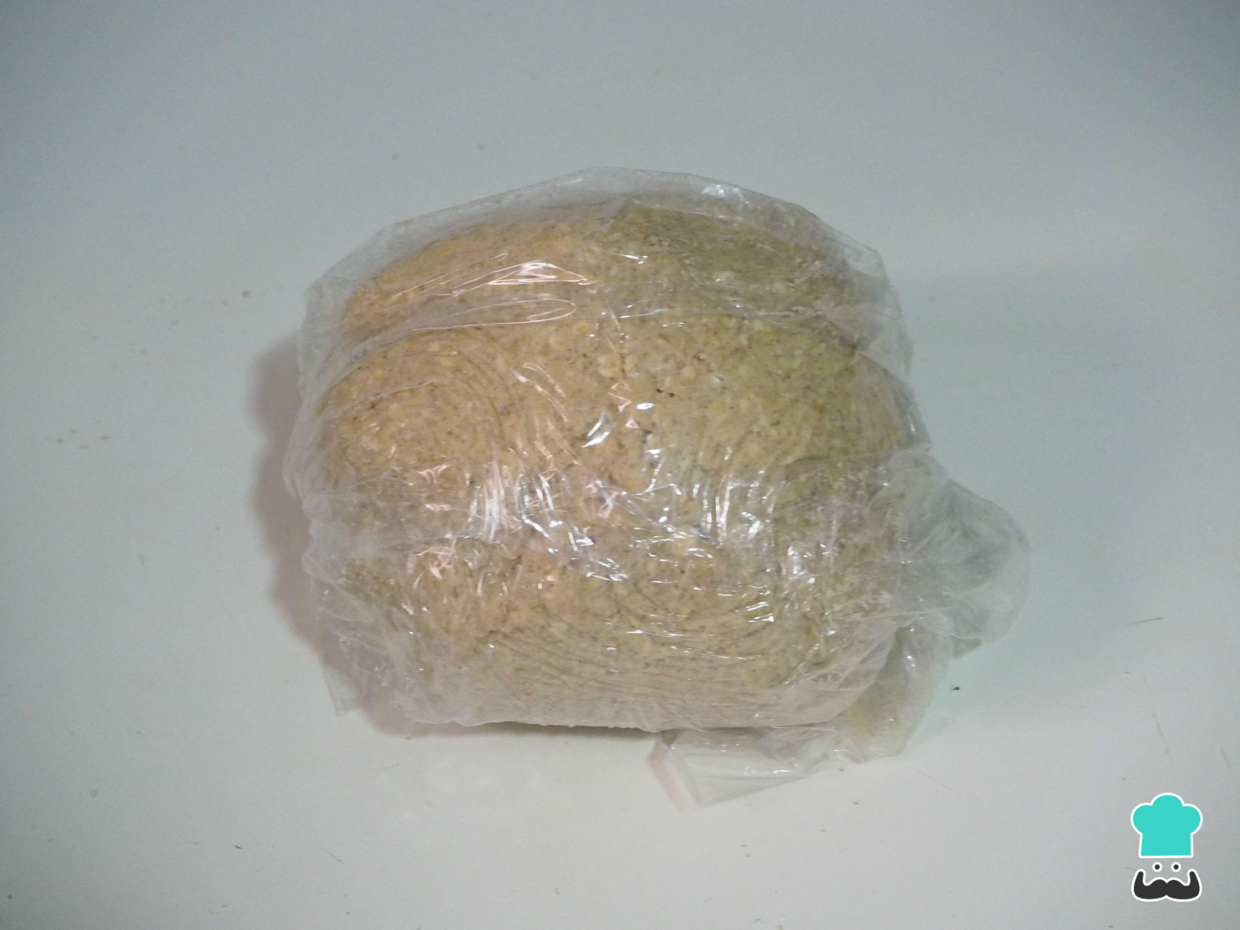 Hacemos una bola con la masa y la envolvemos en papel film. La dejamos reposar en la nevera durante, al menos, media hora. Este paso no es imprescindible pero sí recomendable para que las galletas de avena sanas que estamos preparando queden con una textura más crujiente.
