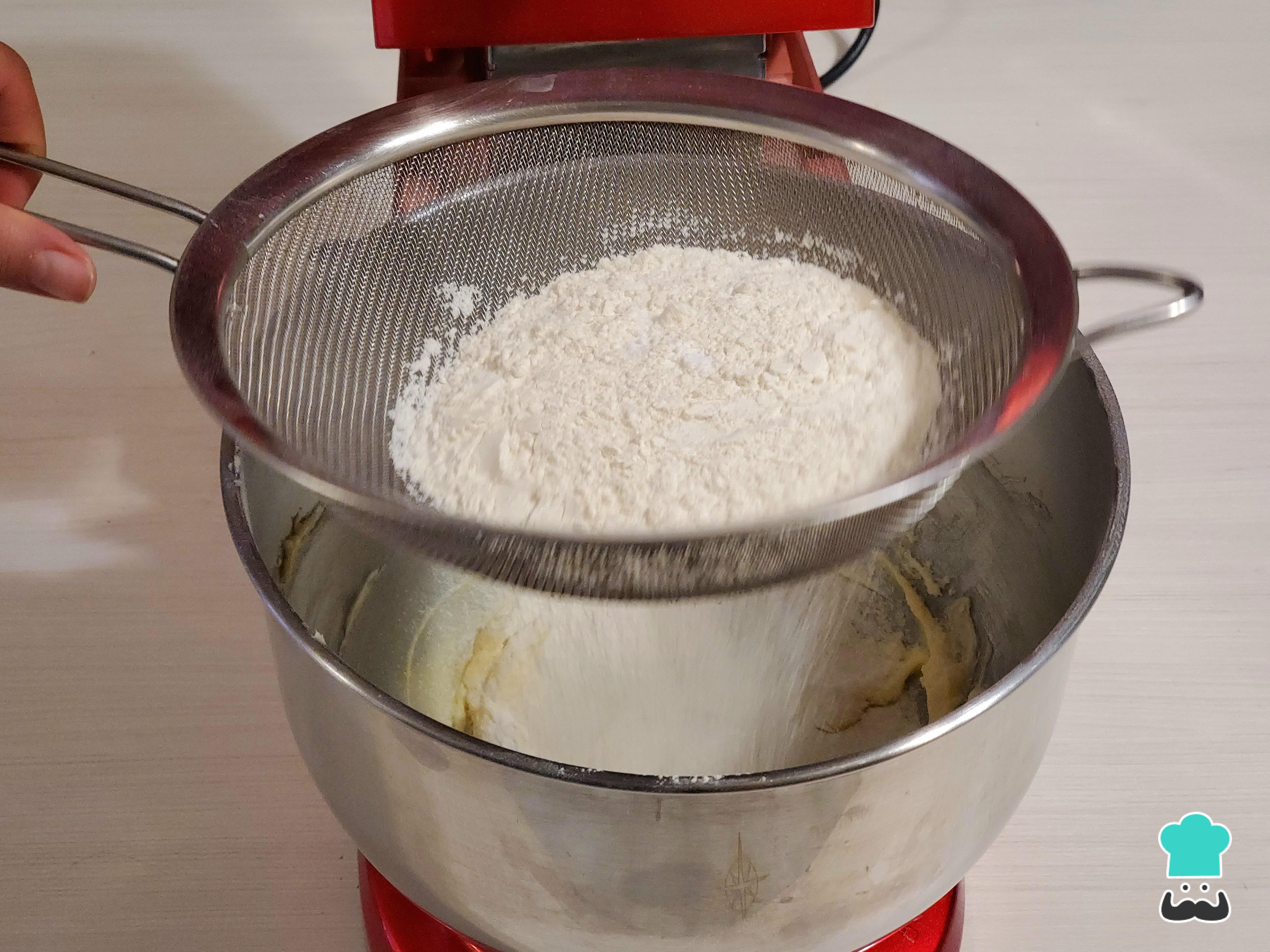 Agrega los ingredientes secos: la harina y una pizca de sal para realzar el sabor dulce. Si la harina o el azúcar impalpable están grumosos, tamízalos previamente para obtener una textura más fina. Bate en velocidad media hasta que la harina se incorpore y se forme una masa granulada.