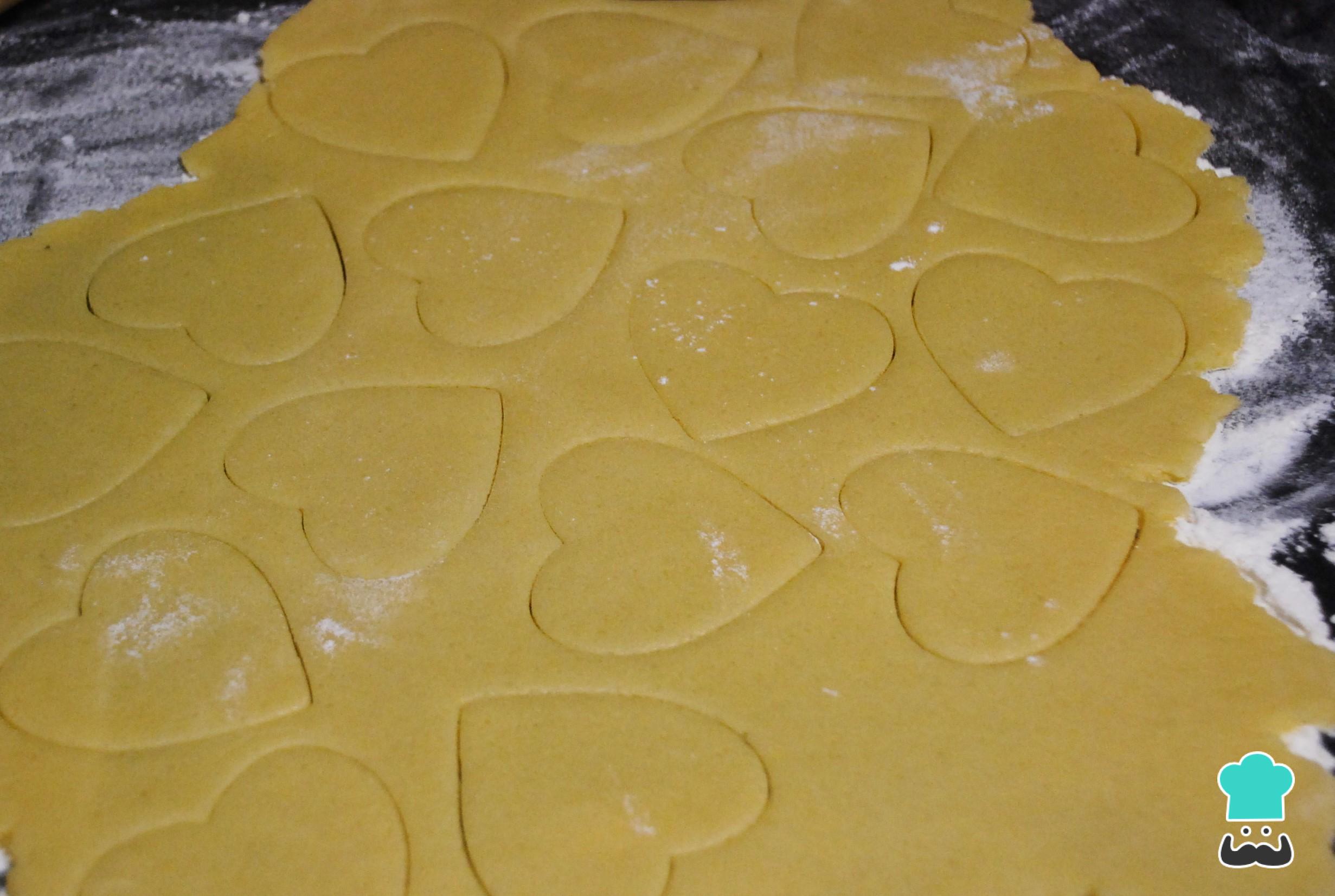 A continuación, saca la masa del refrigerador y estírala sobre una superficie que hayas enharinado previamente. Puedes ayudarte de un rodillo si lo tienes. Estira hasta que la masa quede de un centímetro o dos de grosor. Utiliza un corta pastas o un cuchillo para que cortes las galletas de la forma que prefieras, en este caso haremos galletas con forma de corazón.