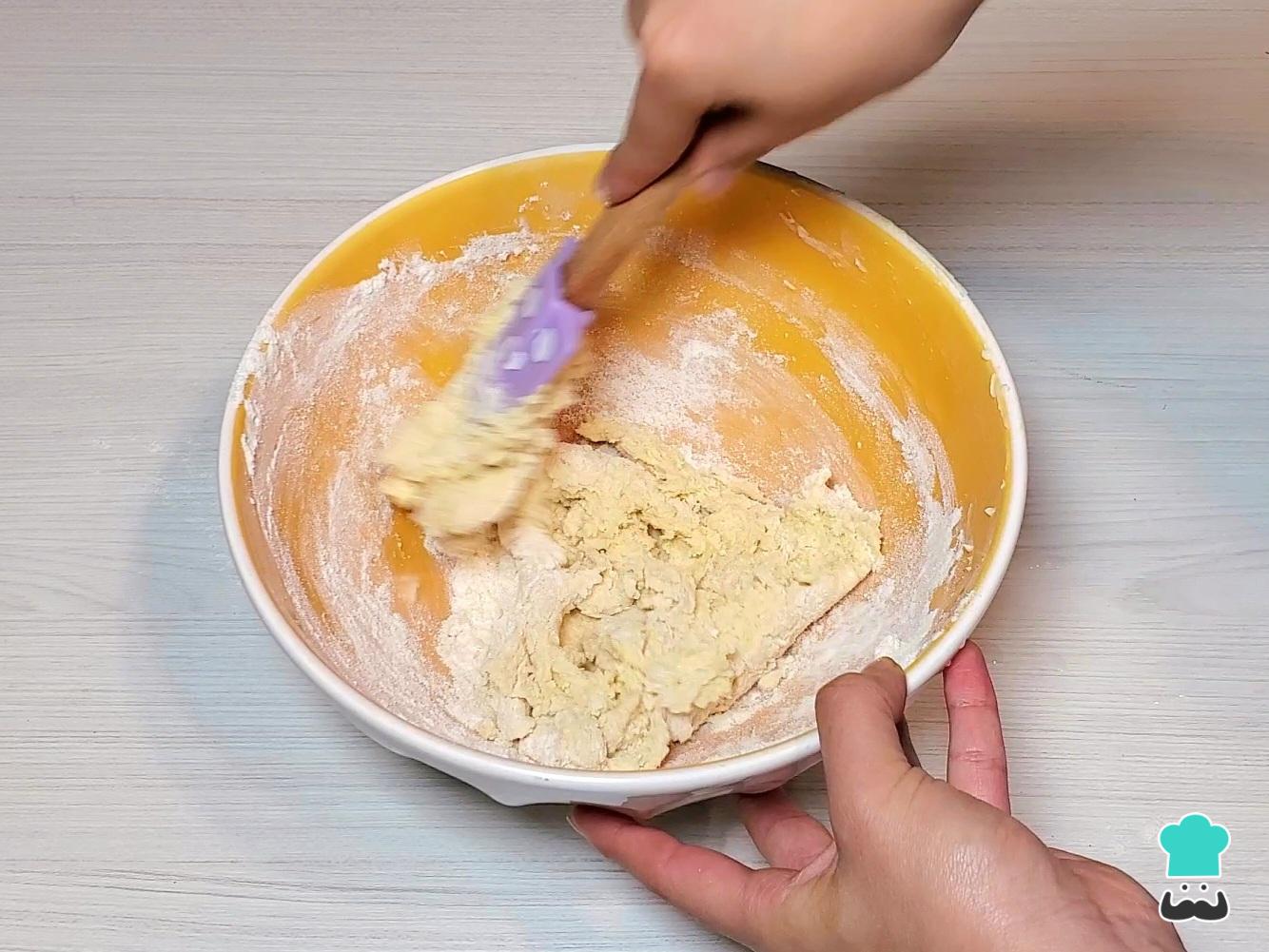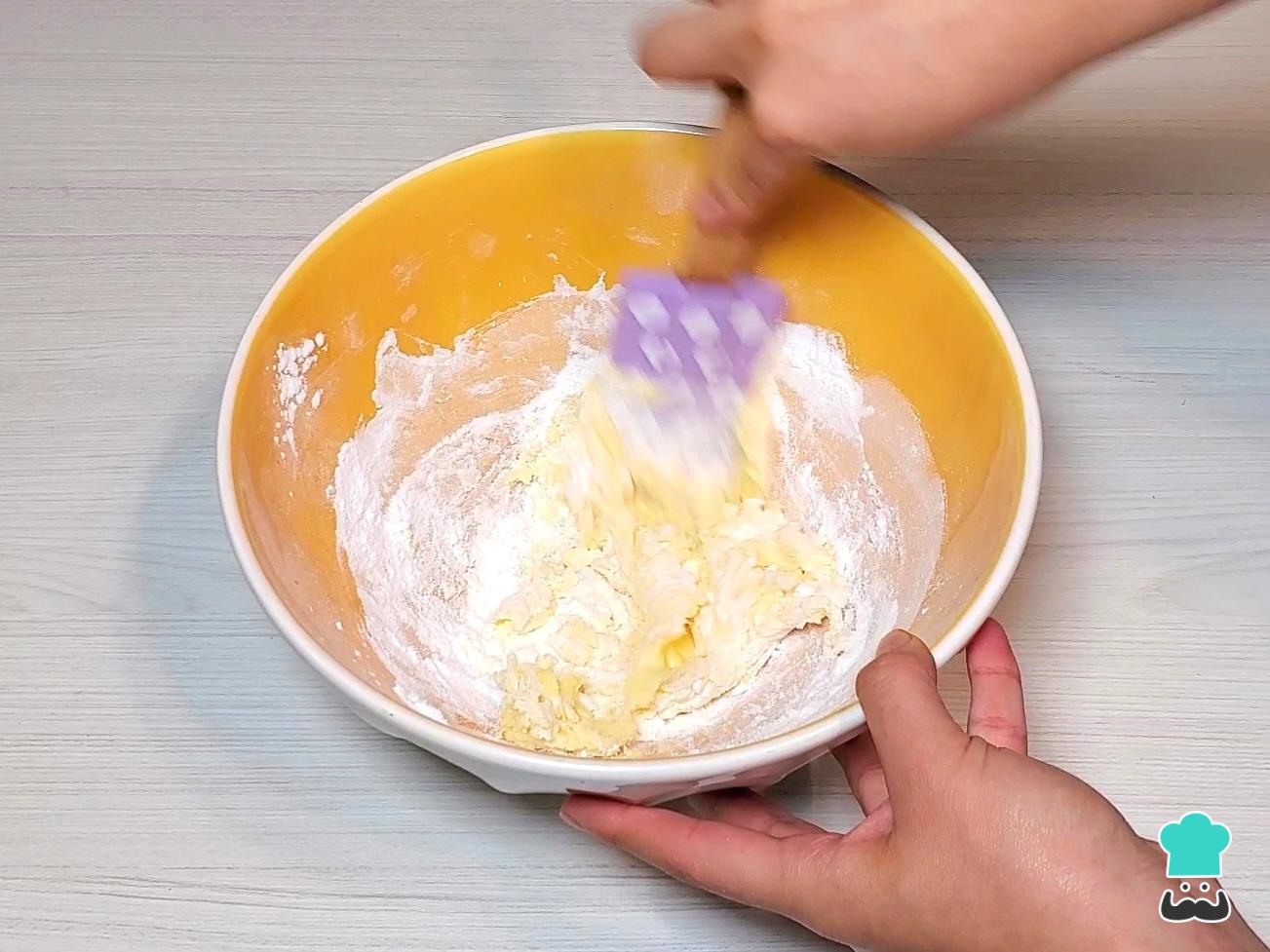 Incorpora todos los ingredientes secos, que son la harina y una pizca de sal. Remueve bien mezclando con una espátula de goma o, si prefieres, utiliza las manos para mezclar, pero sin llegar a amasar para evitar desarrollar el gluten y que las galletas caseras de mantequilla se vuelvan duras.