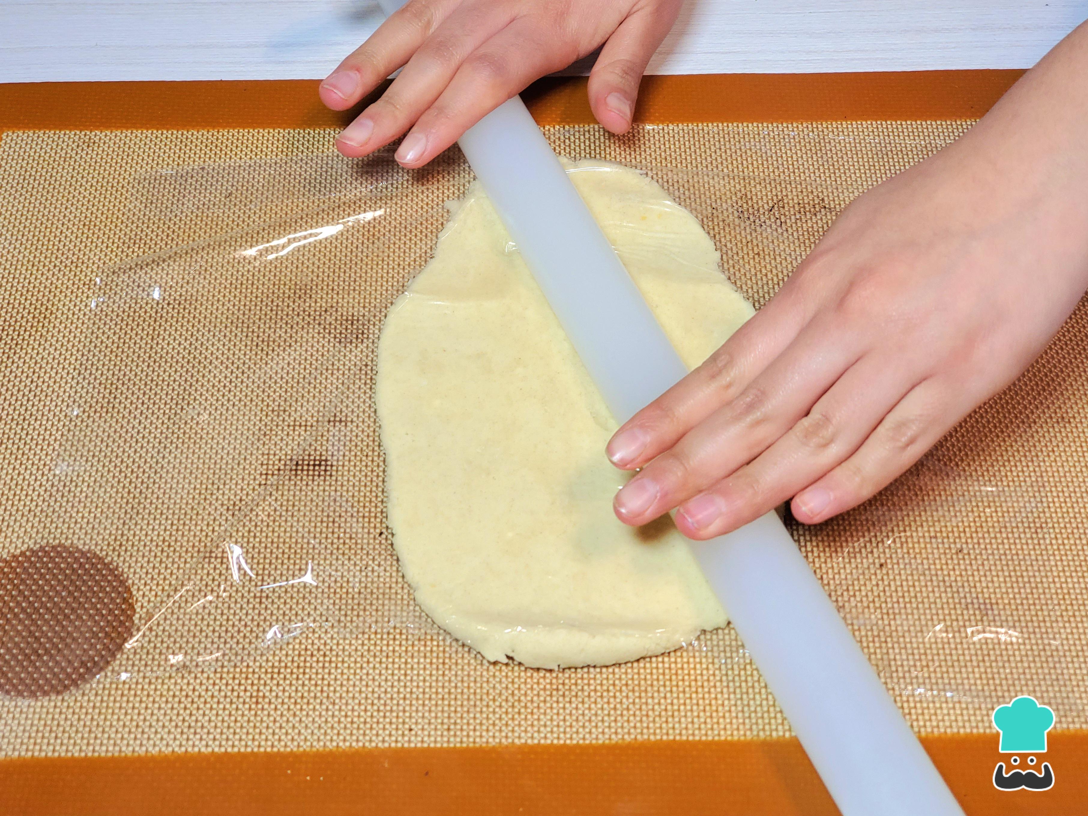 Coloca la masa en un tapete de silicona apto para el horno o sobre papel film o manteca. Cubre con otro papel manteca o papel film y, luego, estira hasta que quede de aproximadamente 1 cm de grosor. Refrigera por lo menos 15 minutos o congela hasta endurecer.