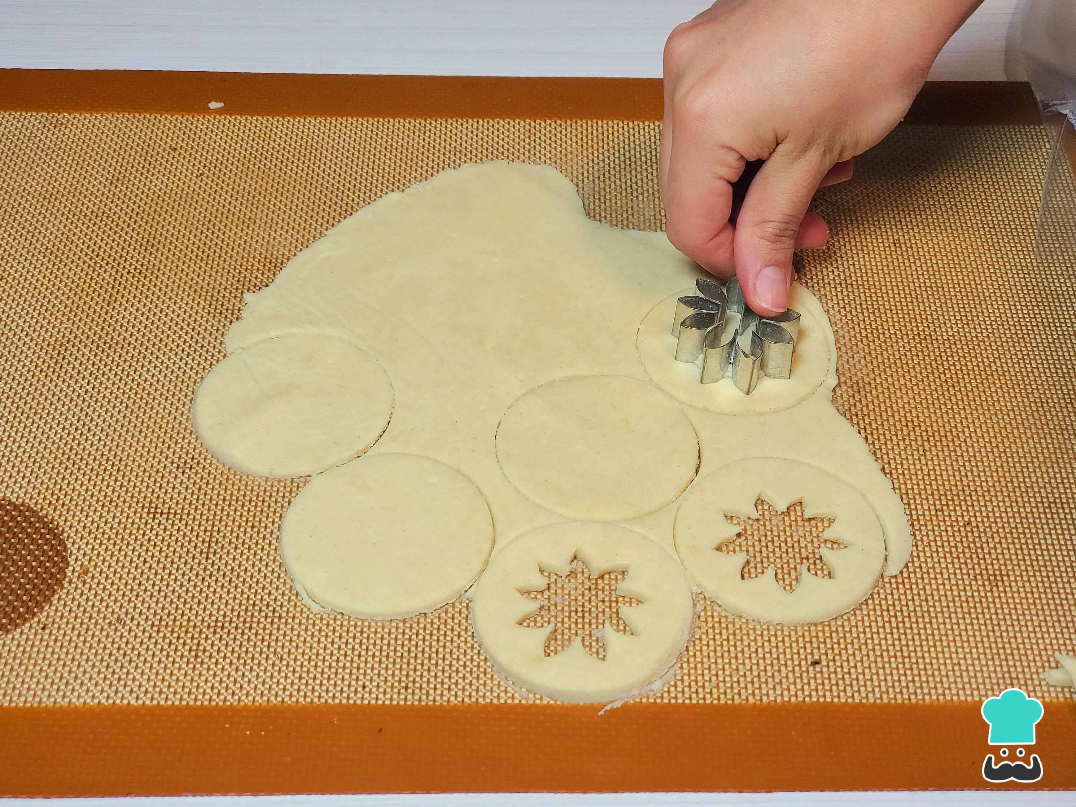 Vuelve a congelar la placa con estas galletas de mantequilla caseras hasta que se endurezcan nuevamente. Luego, retíralas cuidadosamente del tapete de silicona para acomodarlas dejando 3 dedos de separación entre unas y otras.