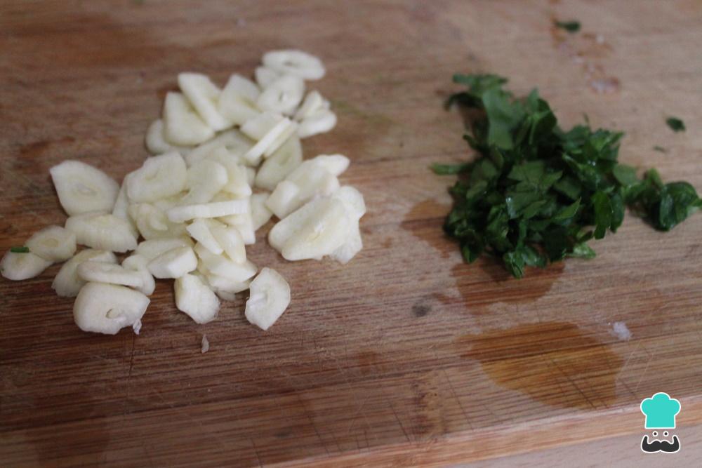 Pela los dientes de ajo y filetéalos. Corta también finamente el perejil.