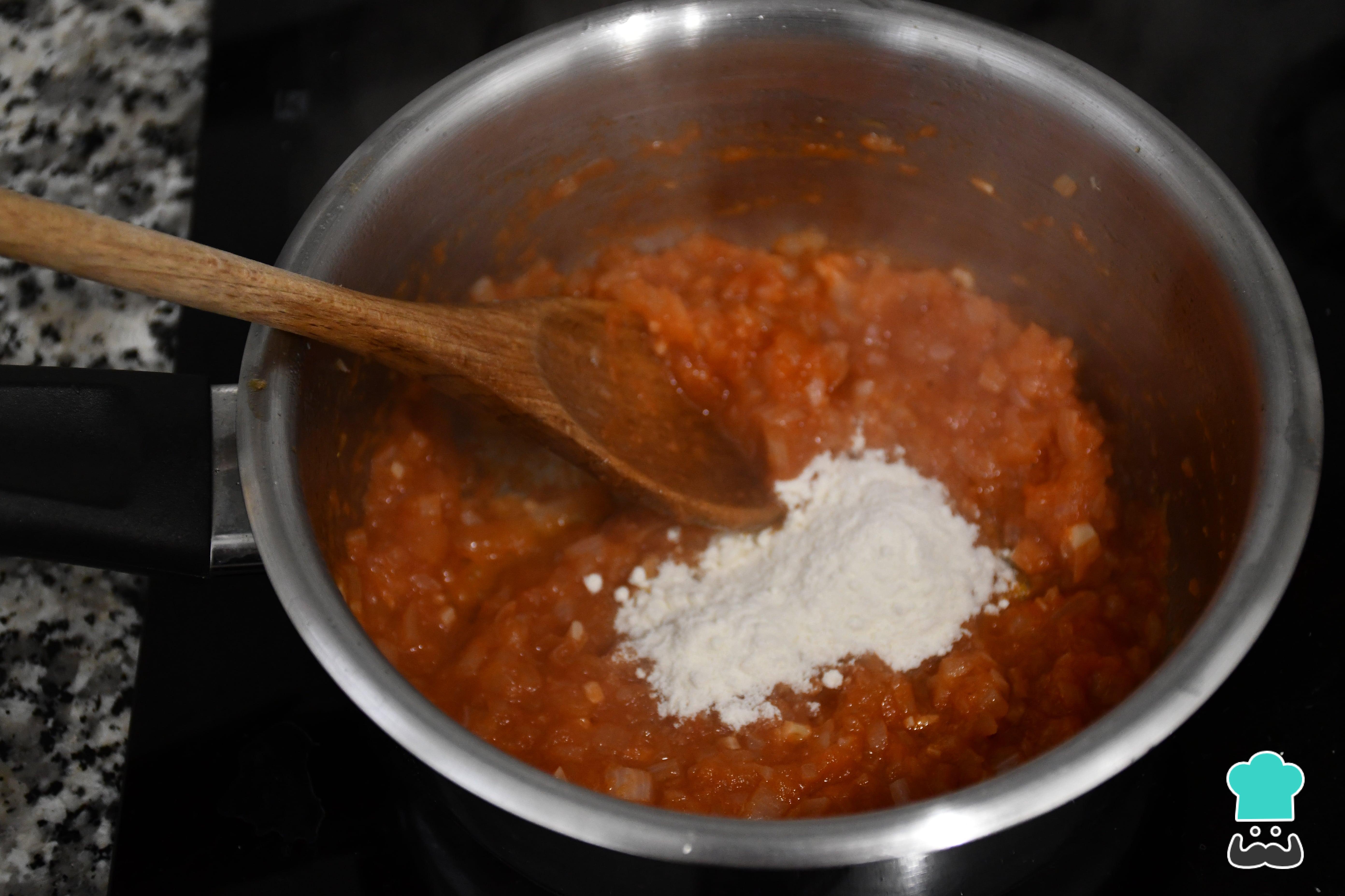 Cuando la cebolla esté dorada, añade el tomate triturado. Deja que se sofría todo y se concentre durante 10 minutos más. A continuación, agrega una cucharada de harina, mezcla bien para que se integre y deja que se cocine durante 4 o 5 minutos.