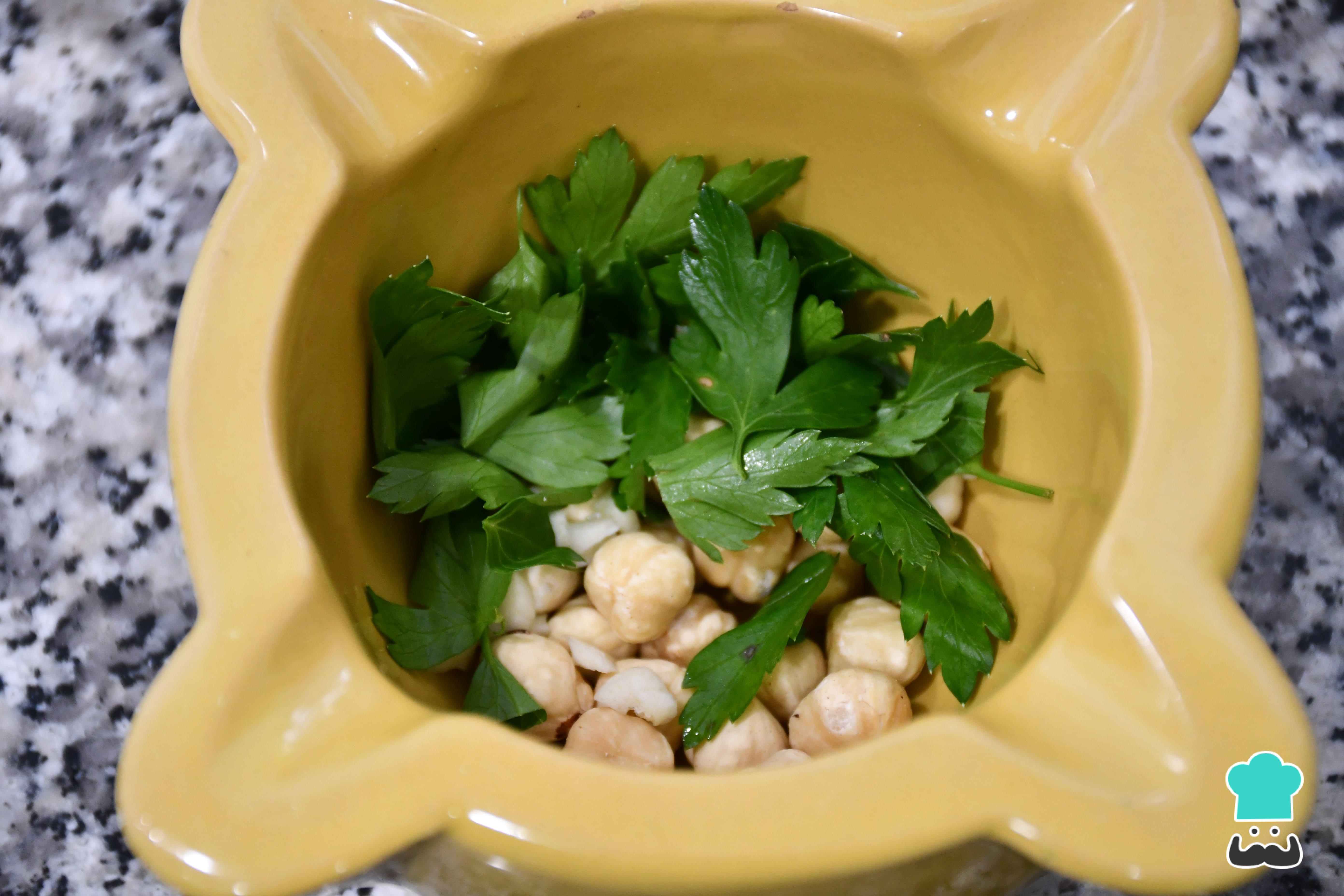 Prepara la picada, que constituye otra de las claves de la receta de garbanzos guisados a la catalana. Para hacerla, en un mortero pon los dos dientes de ajo pelados y cortados, el perejil y el puñado de avellanas. Tritúralo todo hasta que quede una pasta.