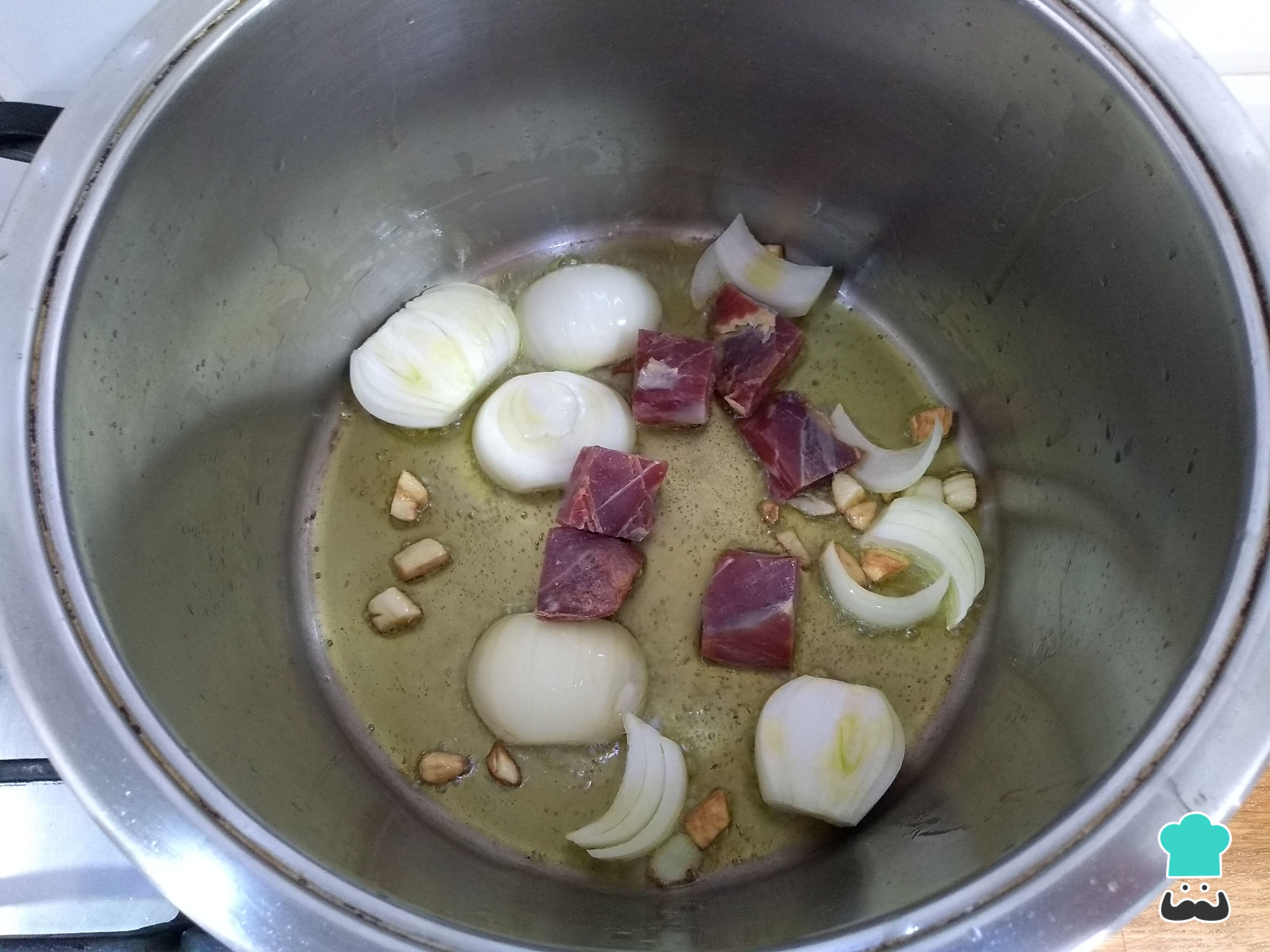 Vierte en una olla express un chorro de aceite y cuando esté humeante sofríe los trozos de ajo. Una vez que tomen color, añade también la cebolla y rehógala durante 2 minutos. Luego, agrega los trozos de jamón y cocina 2 minutos más.