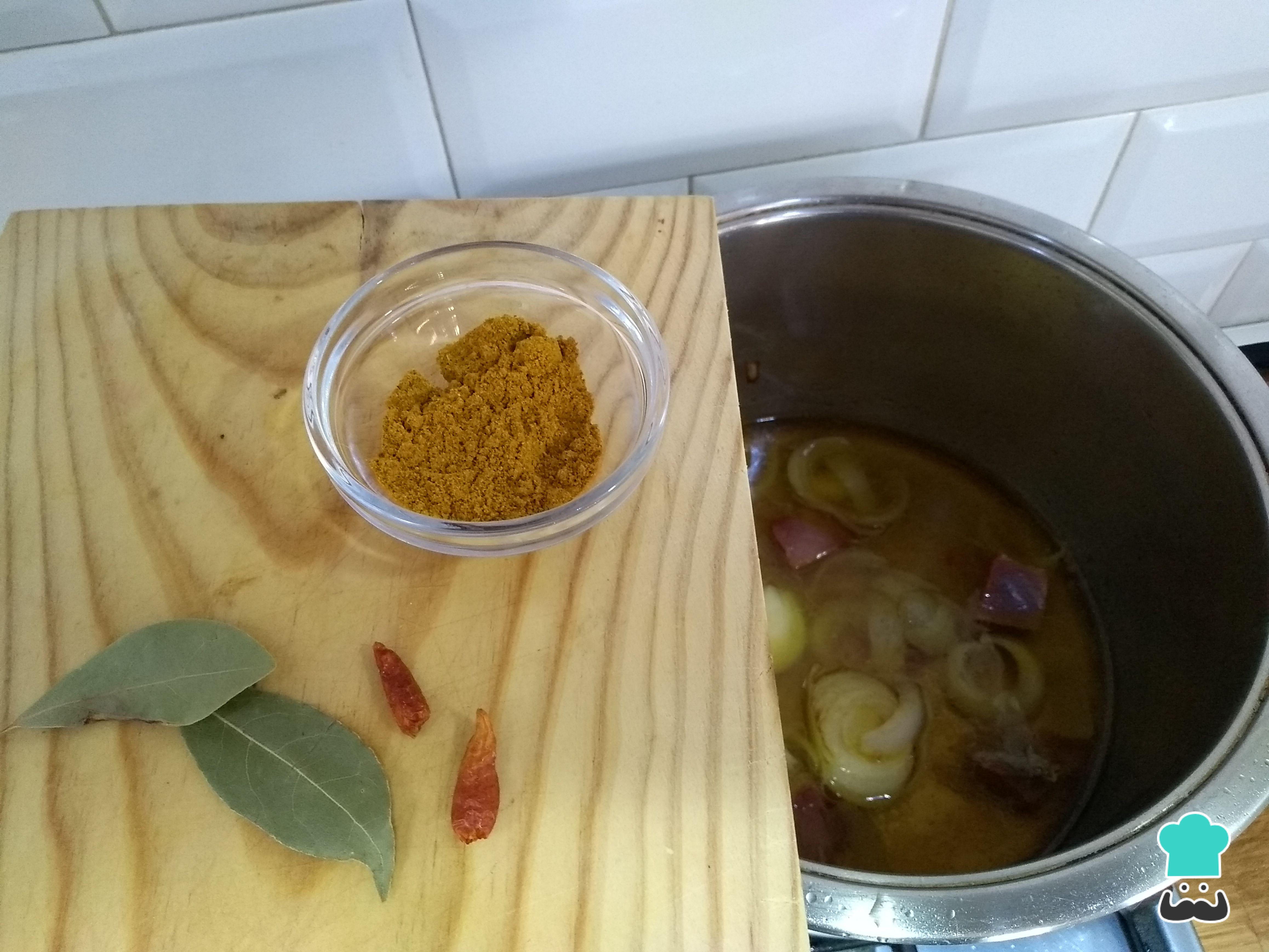Añade una cayena para darle un pequeño toque de sabor al guiso. Este ingrediente es opcional y se puede sustituir por pimentón dulce o picante, una guindilla... Después, agrega las hojas de laurel, un chorro de aceite de oliva y el garam masala.