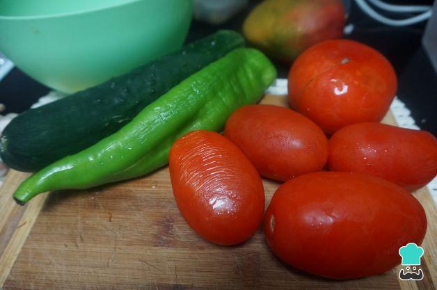 Empieza lavando las verduras. Para ello, lava los tomates y el pimiento verde. Si lo deseas, a los tomates puedes retirarles la piel o dejarla, ya que más adelante se triturará. A continuación, lava medio pimiento y pepino y córtalo en trozos.