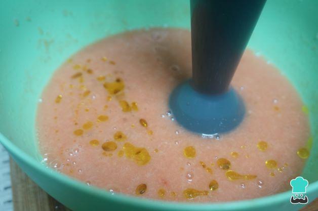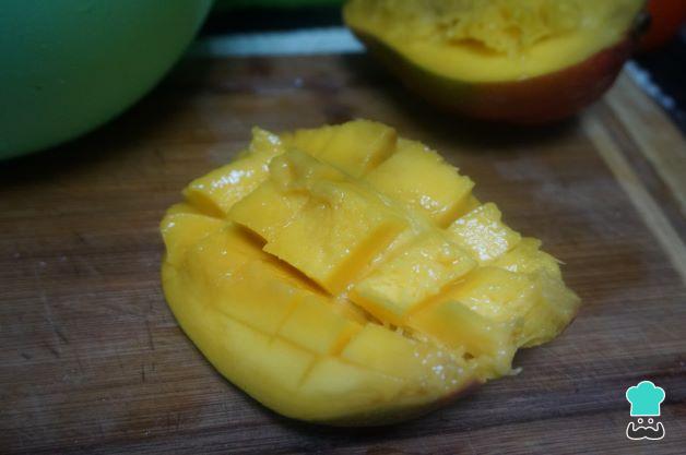 A mitad del triturado añade un buen chorro de aceite de oliva, un chorro de vinagre y sal. Sigue triturando hasta que quede una crema fina. Si te gusta mas líquida añade mas agua, cuando repose suele espesar un poco. Introduce el gazpacho de mango en la nevera y déjalo hasta que esté bien frío o hasta la hora de servir. Cuando vayas a servir si aún no está muy frío puedes añadir cubitos de hielo.