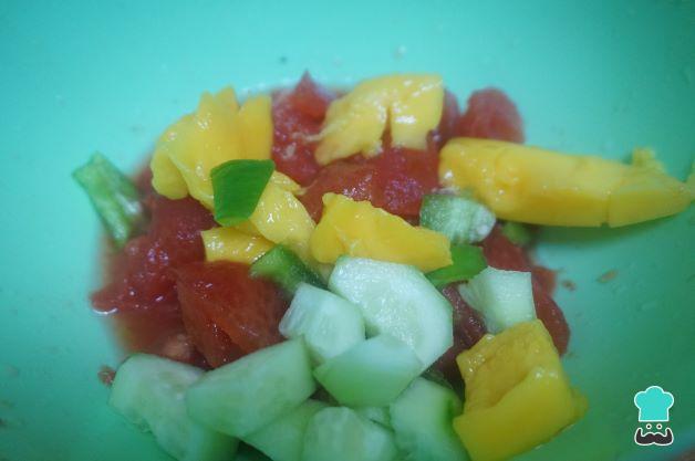 En un bol añade las verduras, los tomates troceados, el pepino, el pimiento y el mango troceado.