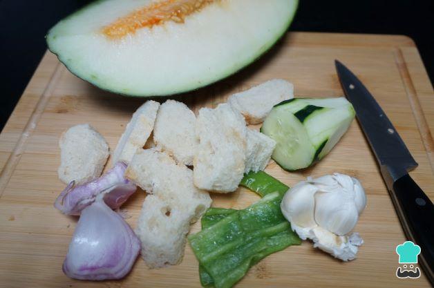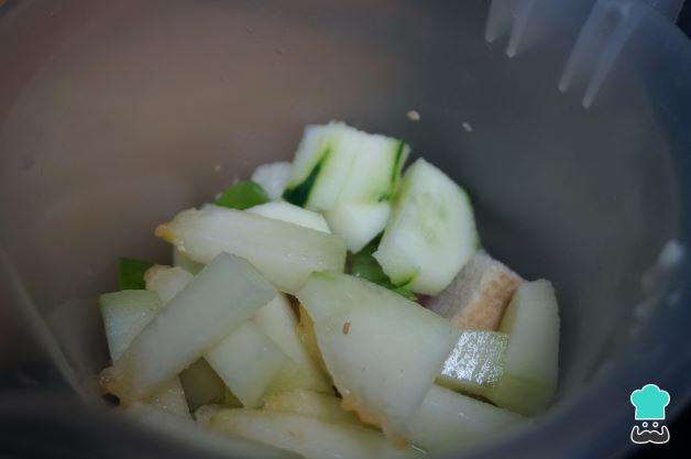 Corta el melón, retira la cáscara y la parte de las pipas, trocea. Añade en el vaso para triturar junto con las verduras. Vierte un poco de agua y tritura a máxima potencia.