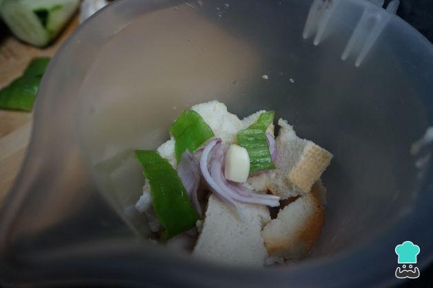 En el vaso triturador coloca el pimiento troceado, la cebolla cortada en tiras, el pan en remojo y el diente de ajo pelado. A continuación, pela el pepino, retira las semillas y trocea.