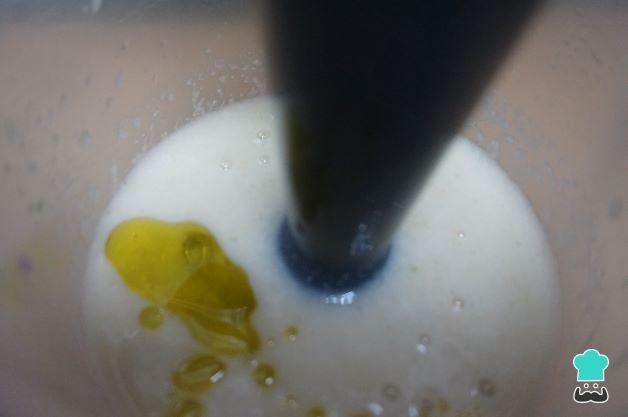 Añade un chorro de aceite, sal y vinagre, sigue triturando y ve añadiendo más aceite poco a poco hasta que emulsione la crema. Prueba y rectifica de sal o vinagre y termina de triturar hasta que quede una crema fina, ni muy espesa ni muy clara.