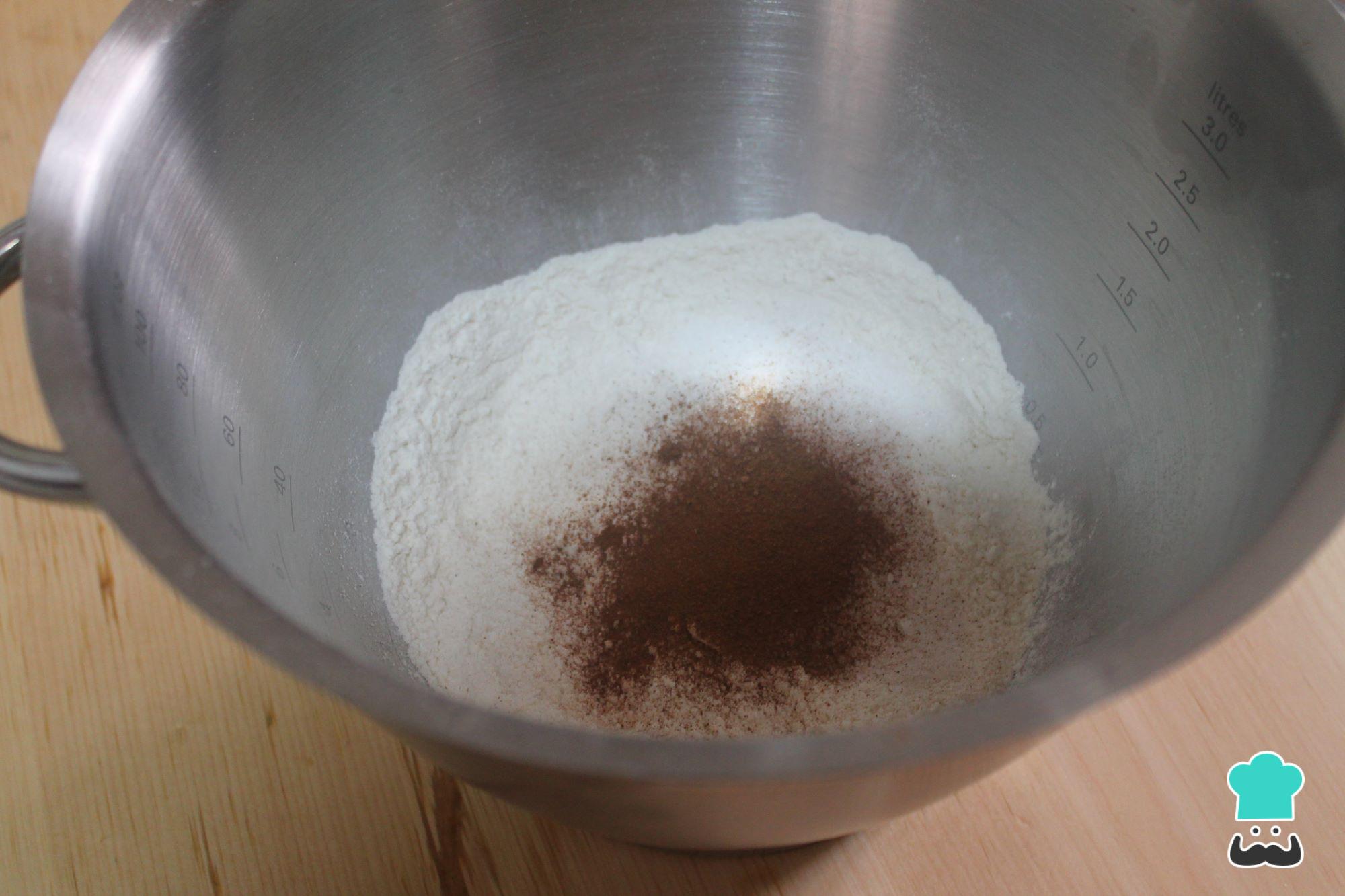 En el bol de la amasadora mezcla la harina de fuerza junto con una pizca de sal y otra de canela. Remueve con una cuchara de madera ligeramente.