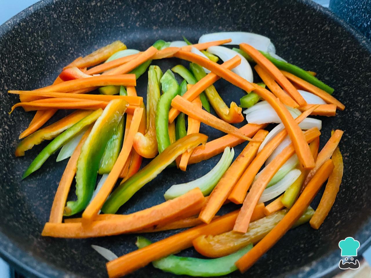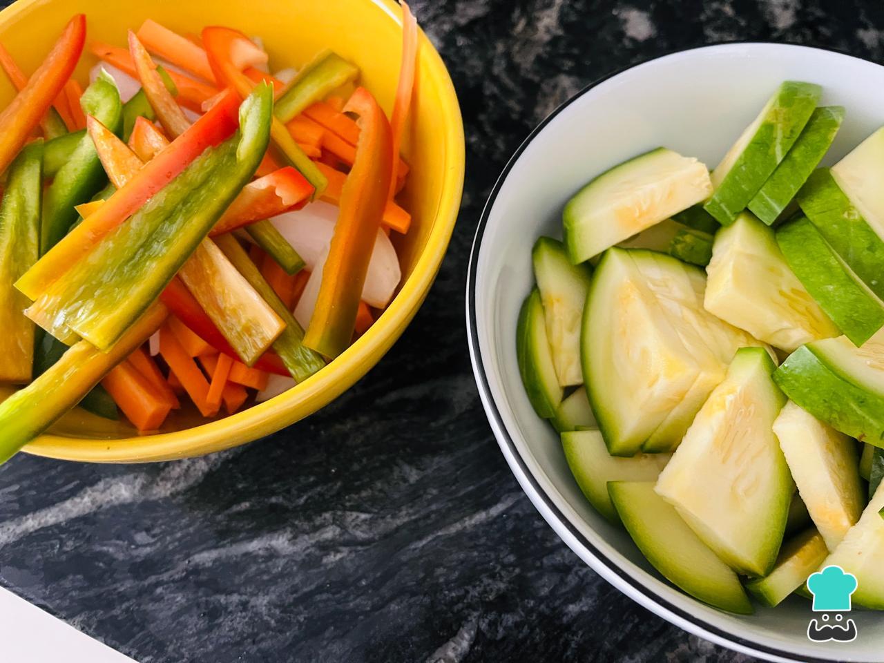 Lava, pela y corta las verduras, separándolas según su tiempo de cocción. La cebolla, morrón y zanahoria necesitarán más tiempo, mientras que el zapallito se cocina más rápidamente. Corta la cebolla en juliana, el morrón en tiras y la zanahoria en bastones medianos.