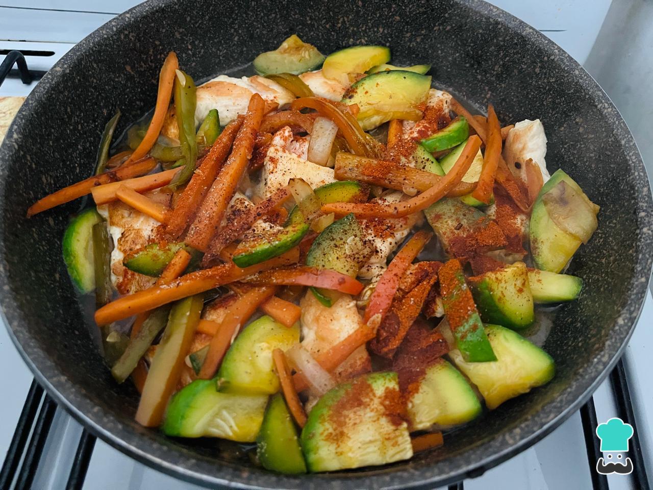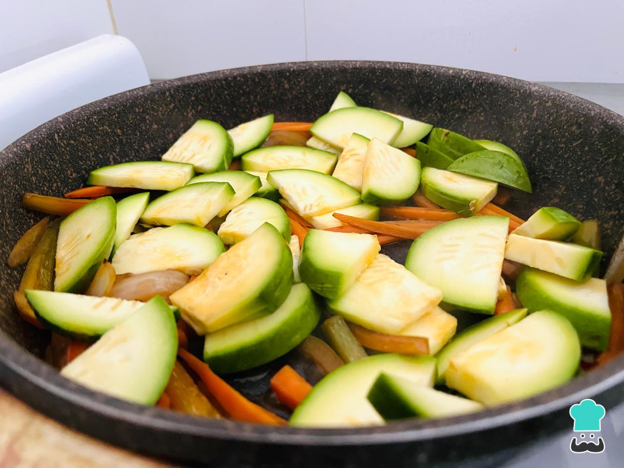 Cuando las verduras base estén tiernas, agrega el zapallito cortado en medias lunas. Saltea durante 3-4 minutos hasta que esté ligeramente dorado, pero mantenga su forma. Reserva todas las verduras en un plato.