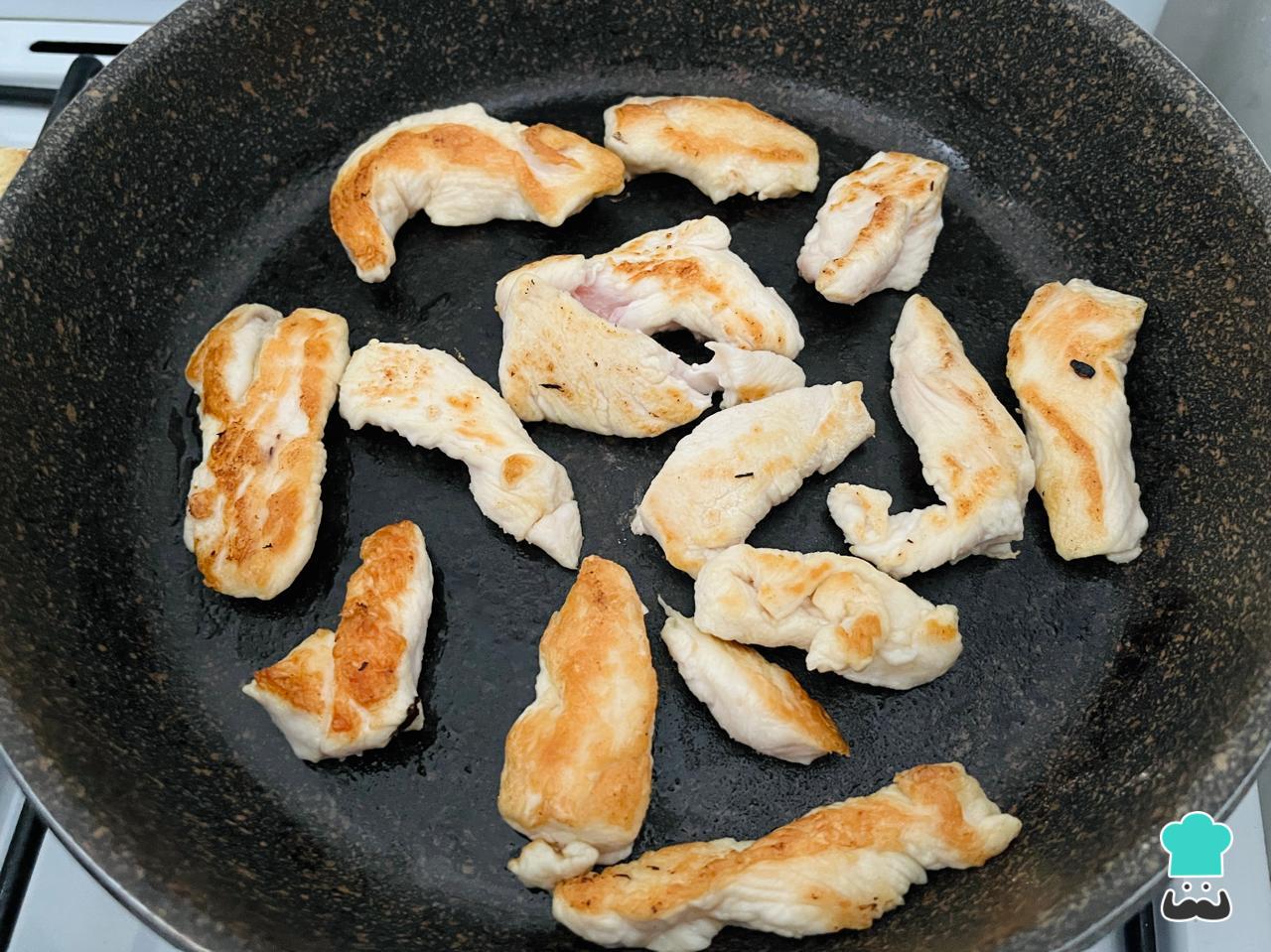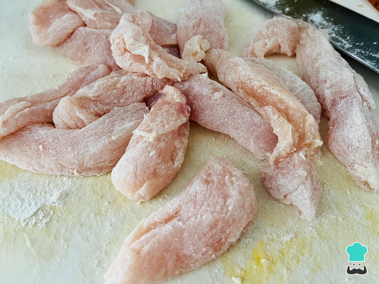 Corta el pollo en tiras uniformes de aproximadamente 2 cm de ancho y cúbrelo completamente con harina sazonada con sal y pimienta. Este paso es fundamental para lograr el dorado perfecto que aportará sabor y la textura cremosa característica del goulash.