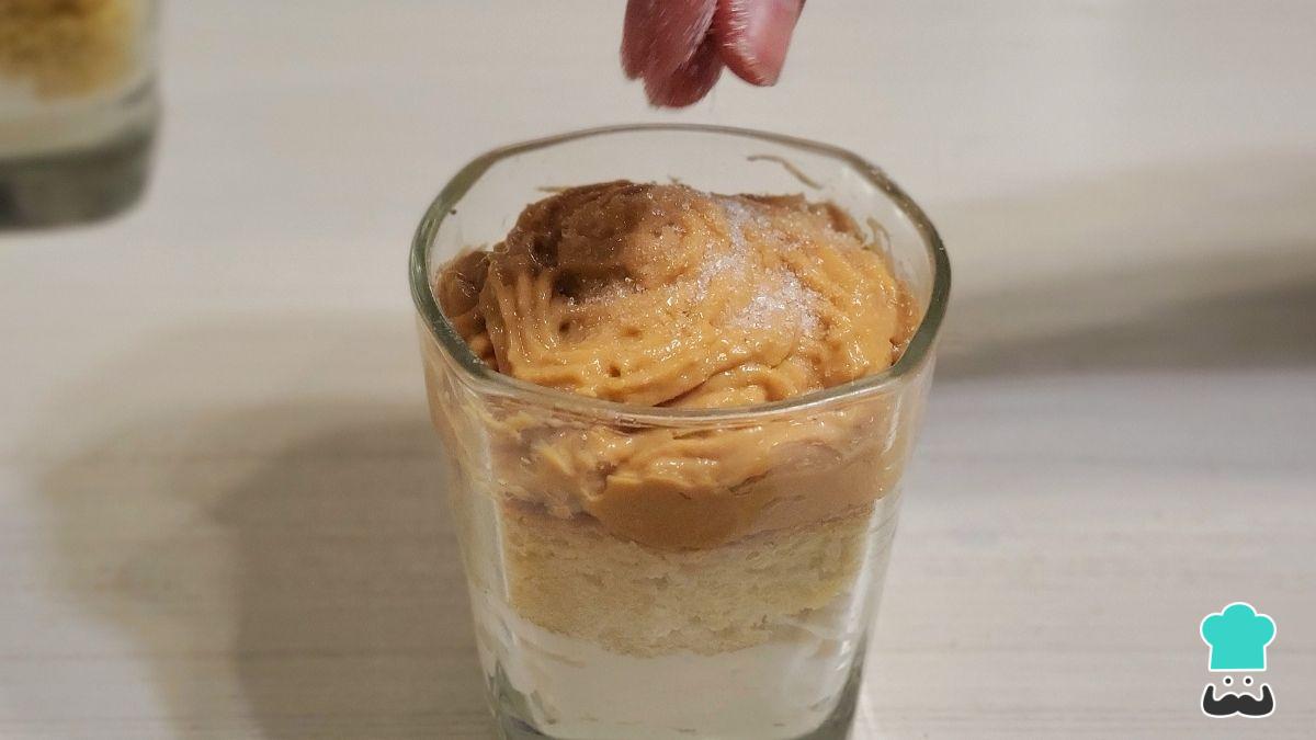 Para montar el postre en vasos, coloca primero una base de crema chantilly de aproximadamente un dedo de grosor. Puedes utilizar una manga pastelera con boquilla lisa o de estrella para que sea más fácil y vistoso al servir.