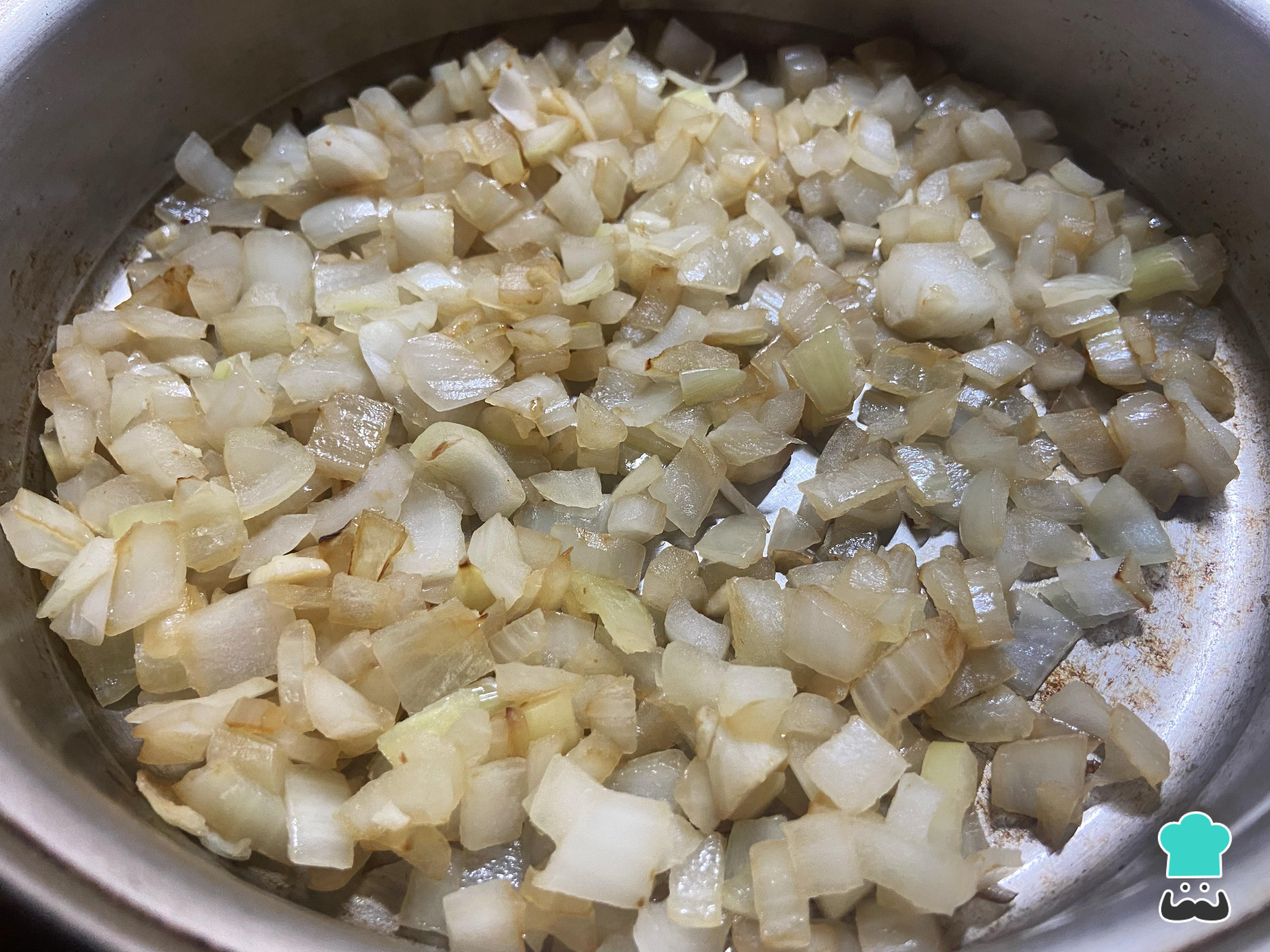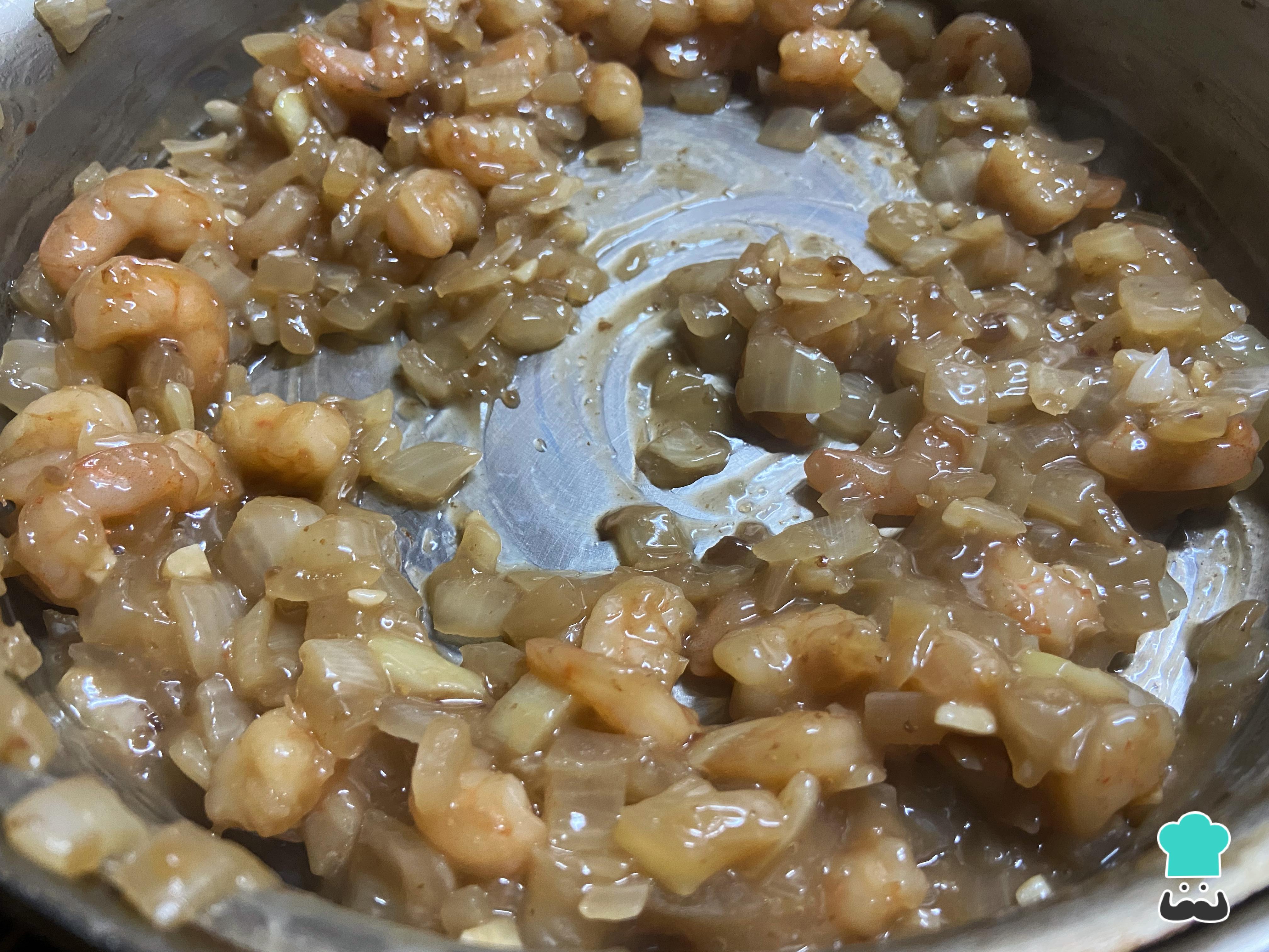 Lleva la salsa de soja a la sartén con los langostinos dorados y la cebolla previamente caramelizada. En el fuego medio, remueve tu preparación hasta que la maicena espese. Retira y reserva hasta que enfríe.