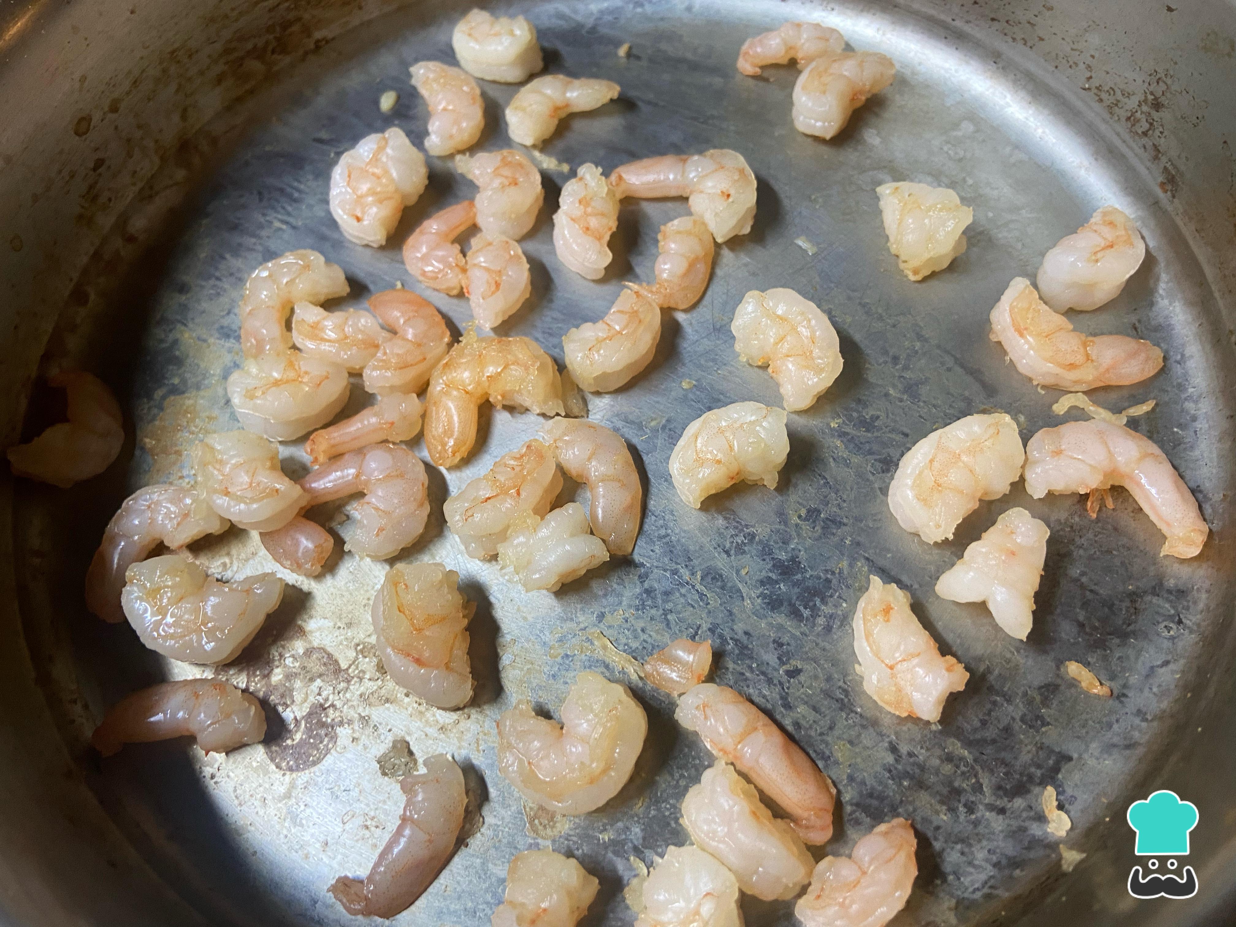 Retira las cebollas y resérvalas. En la misma sartén, con una nueva cucharadita de aceite, dora los langostinos crudos por ambos lados. Una vez listos, resérvalos fuera del fuego.