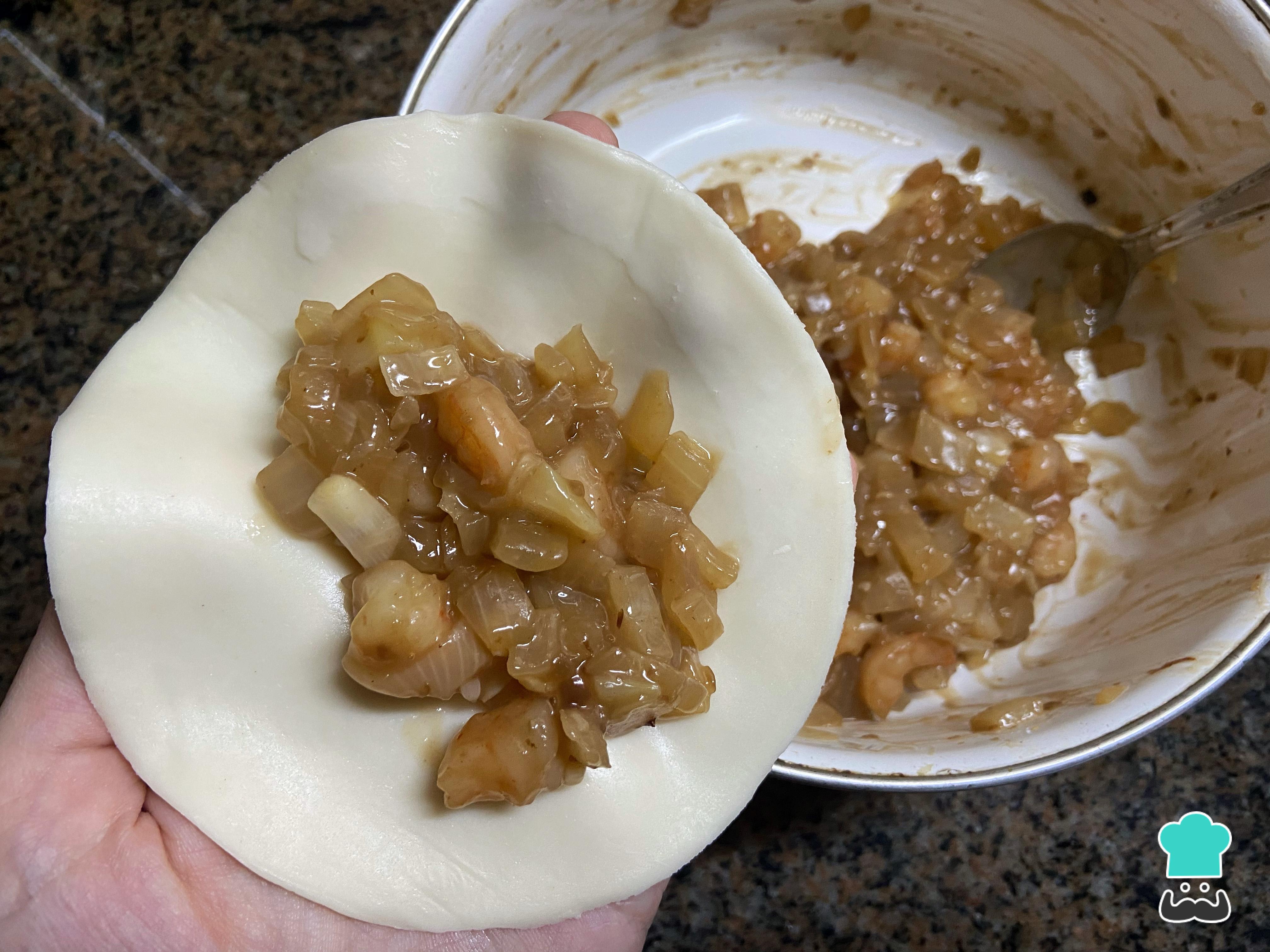 Cuando el relleno de gyozas esté listo, procede a rellenarlas. Para ello, toma un disco y moja el borde de la mitad. En el centro, añade una cucharada del salteado.