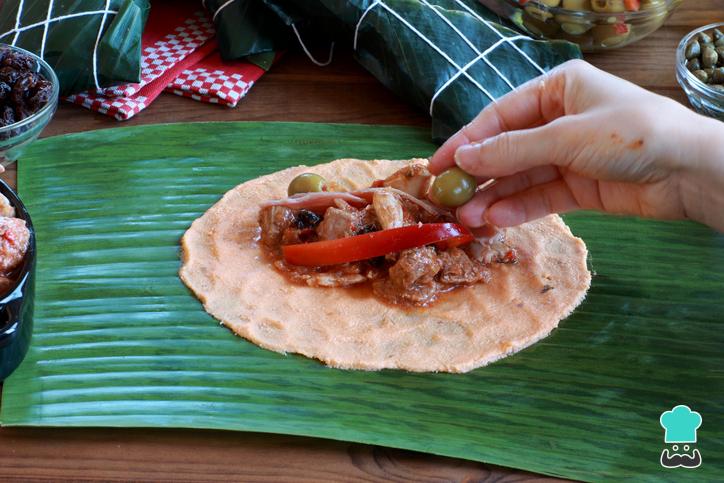 Agrega los ingredientes. Primero, añade el guiso y, luego, decora tu hallaca con las aceitunas, las pasas, la cebolla, el pimentón y la gallina ya hervida y desmechada.