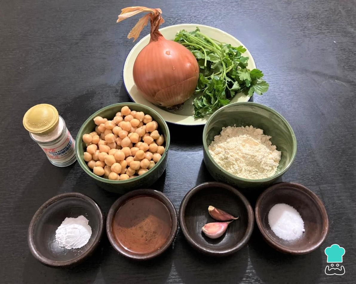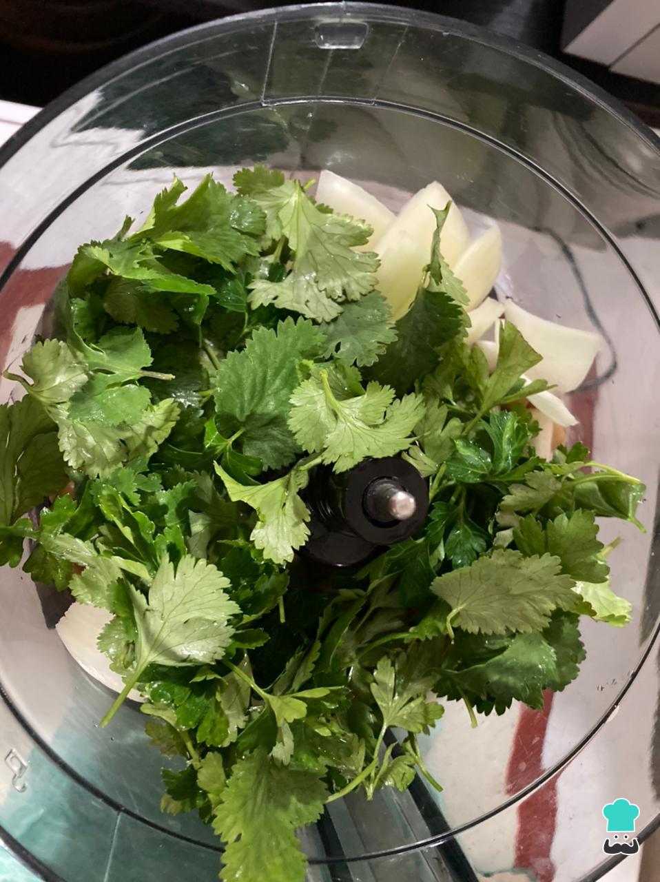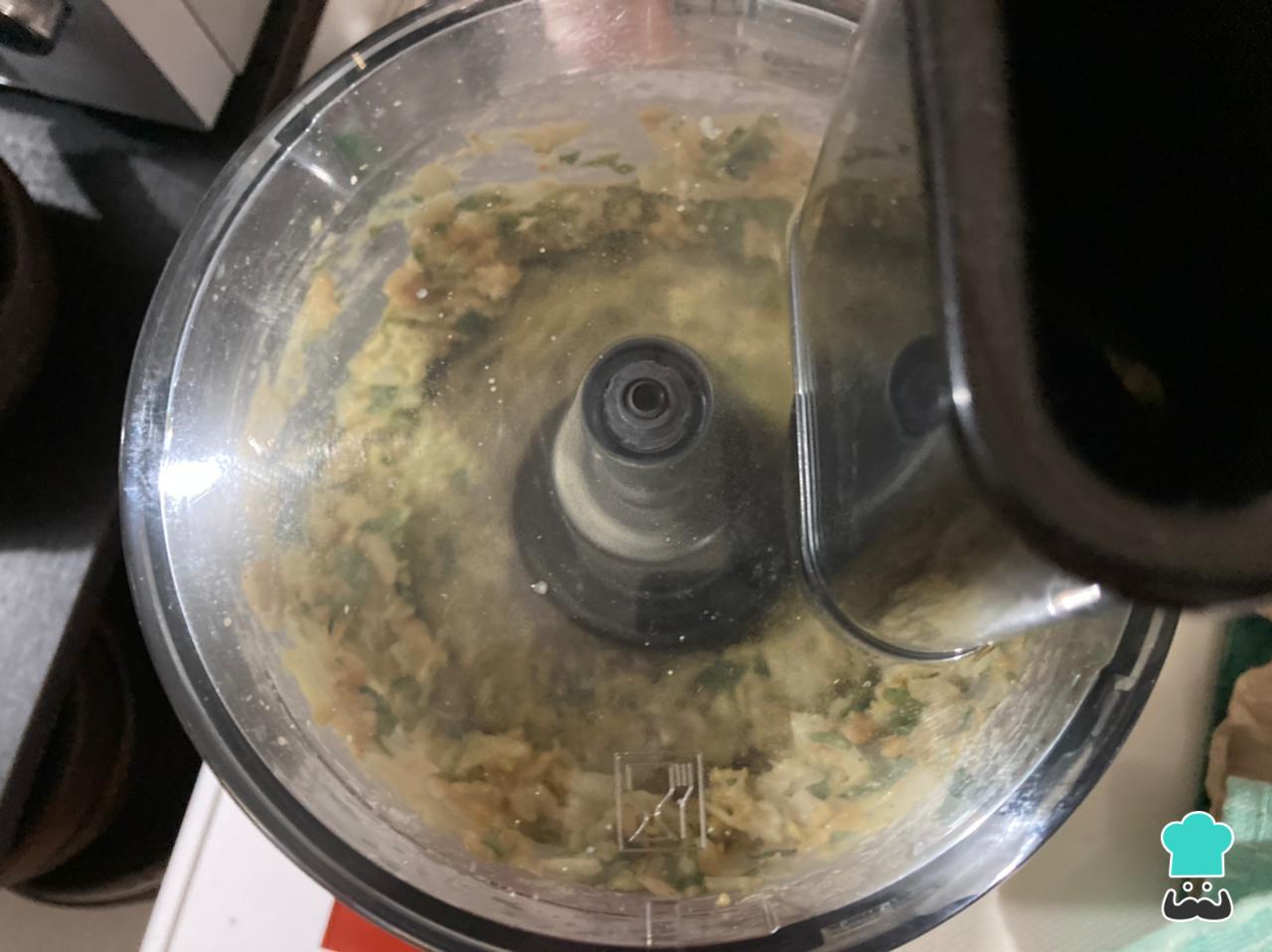 En un robot de cocina o licuadora tritura los garbanzos, la cebolla troceada, el ajo pelado y desvenado y las hojas de perejil y cilantro.